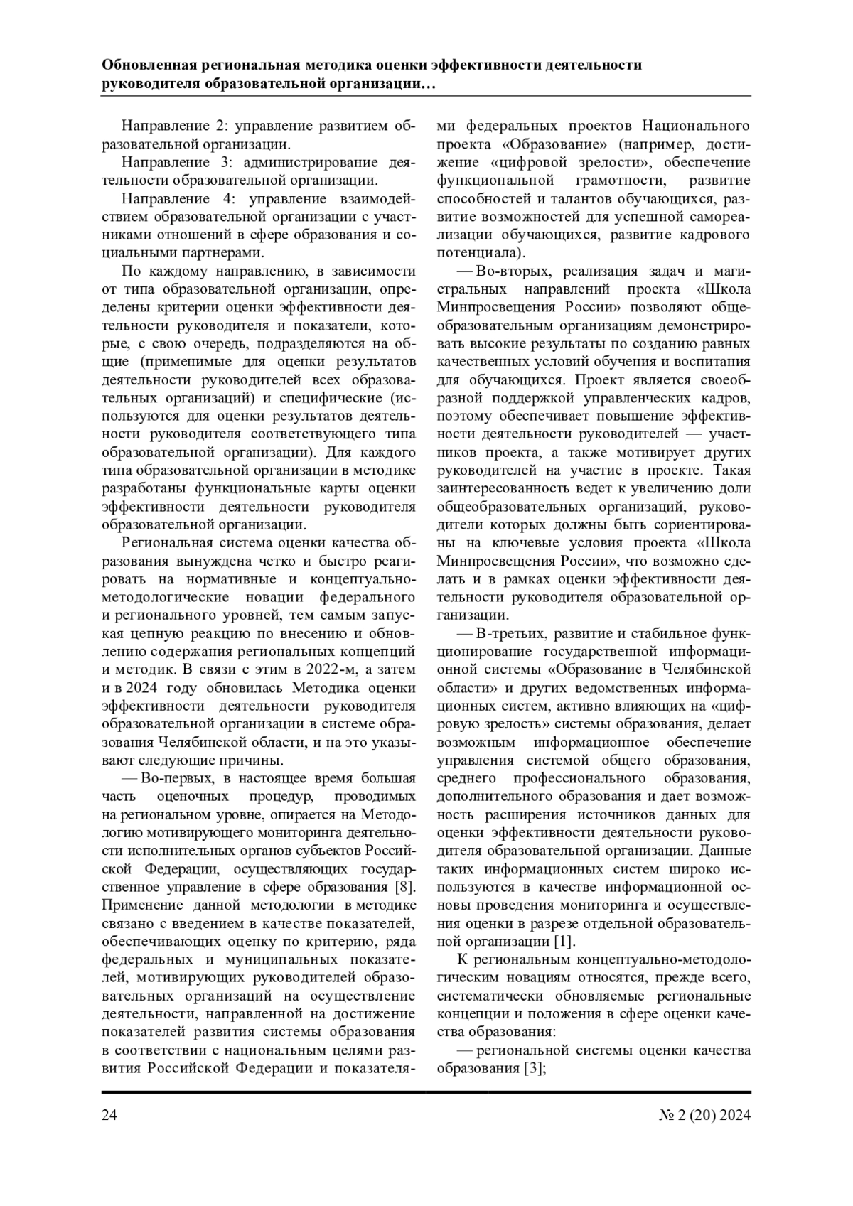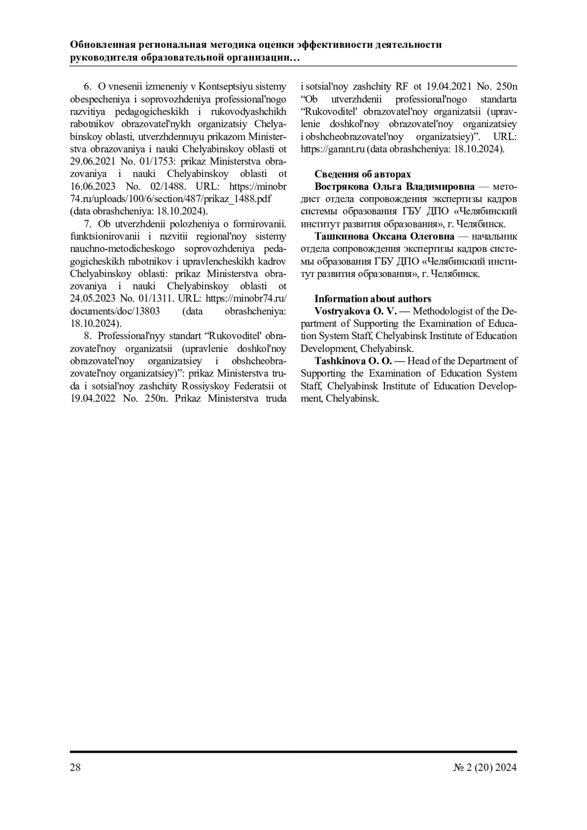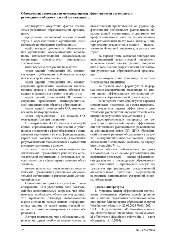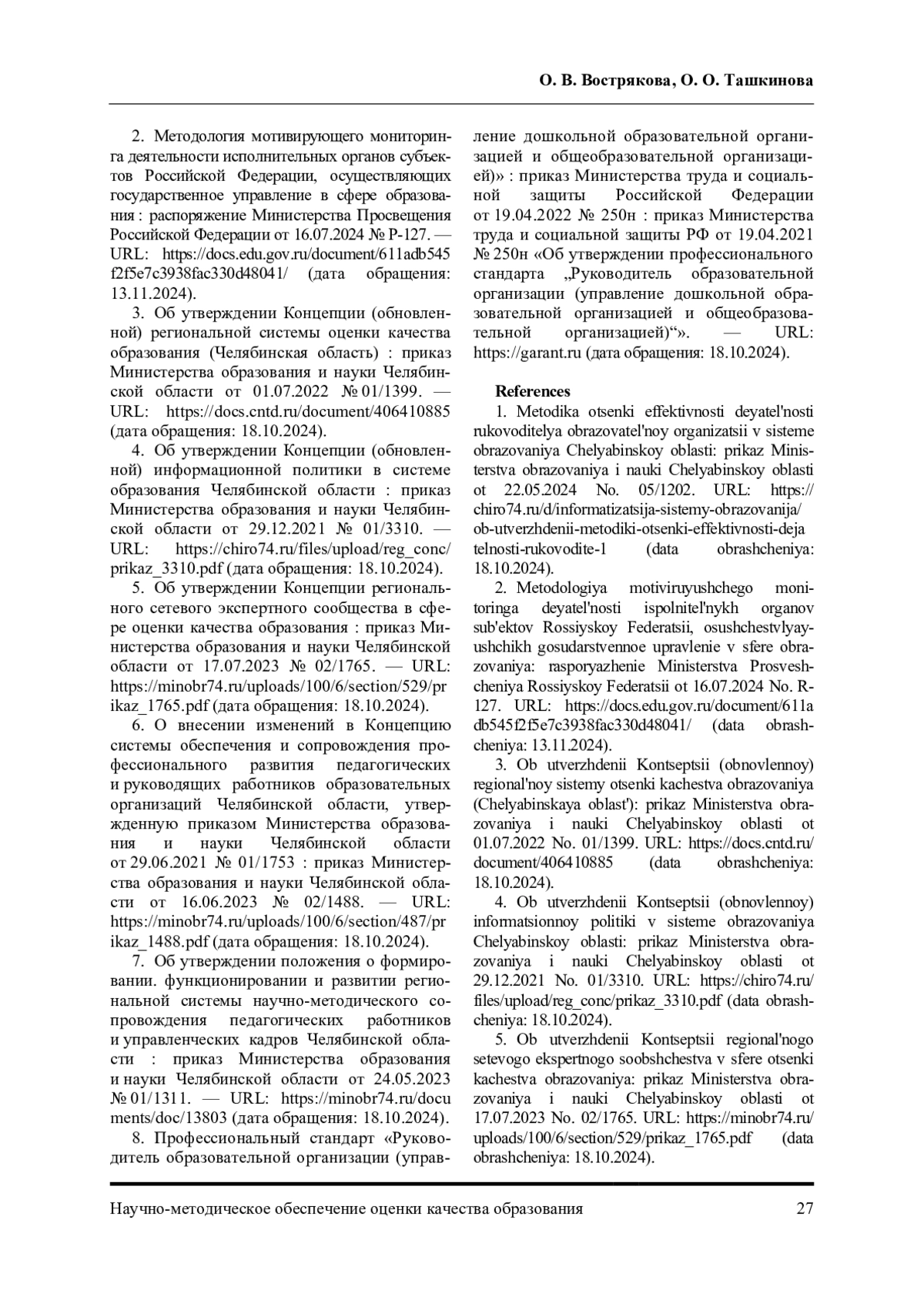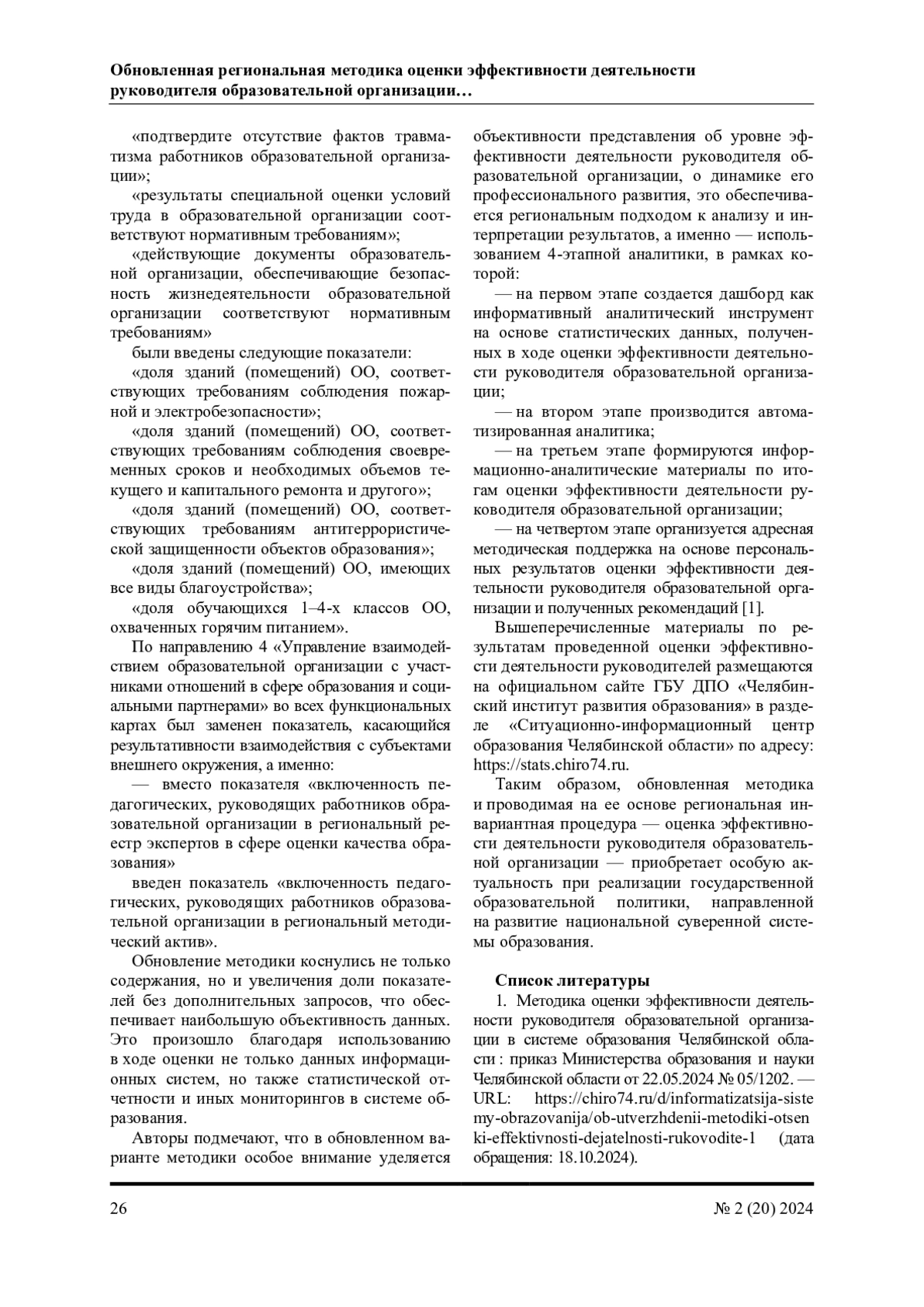 1. Методика оценки эффективности деятельности руководителя образовательной организации в системе образования Челябинской области: приказ Министерства образования и науки Челябинской области от 22.05.2024 № 05/1202. - URL: https://chiro74.ru/d/informatizatsija-siste my-obrazovanija/ob-utverzhdenii-metodiki-otsen ki-effektivnosti-dejatelnosti-rukovodite-1 (дата обращения: 18.10.2024).