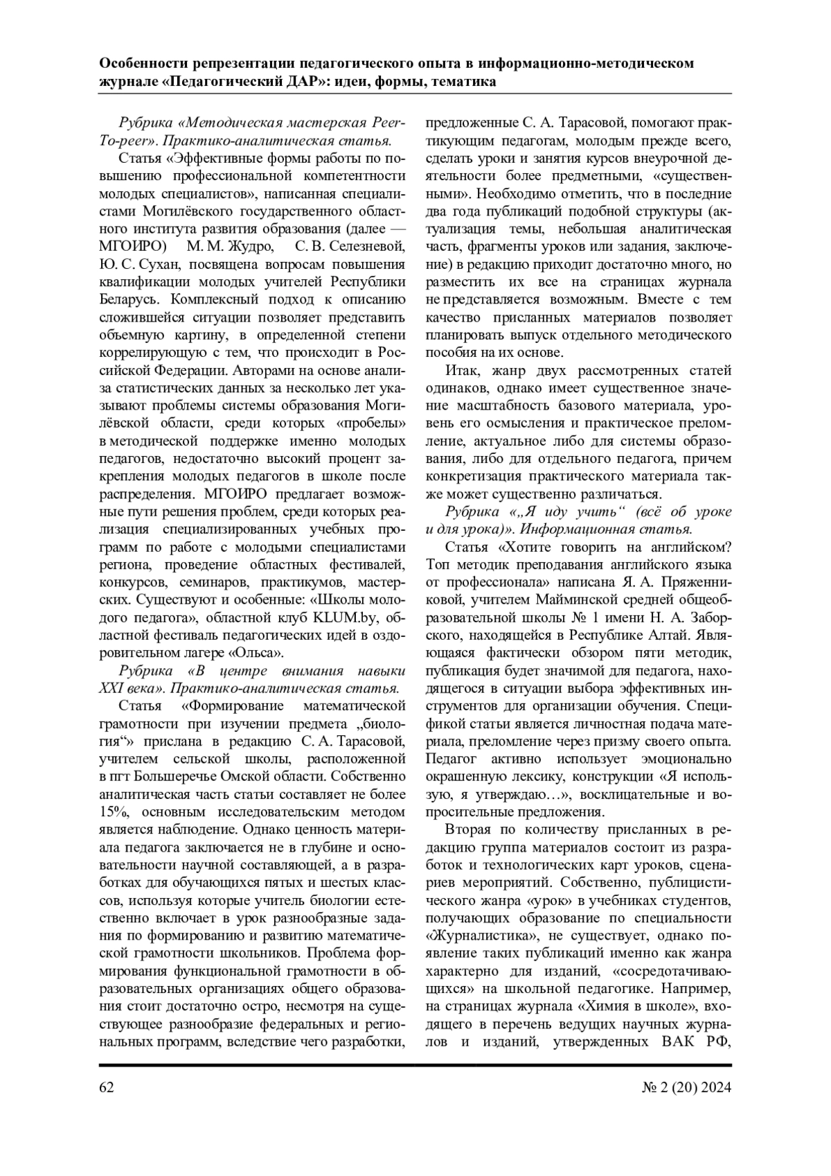 Статья рассматривает особенности репрезентации педагогического опыта в информационно-методическом журнале «Педагогический ДАР», который объединяет авторов из различных регионов России и стран СНГ, входящих в Международный методический центр «Академия педагогического мастерства». Основное содержание статьи заключается в рассмотрении специфики разножанровых публикаций, присланных в редакцию. Отмечается влияние места работы и профессионального опыта авторов на выбор жанра, тематику, содержание публикаций. Анализируются популярные среди авторов жанры, такие как статьи, конспекты уроков, педагогические эссе, и выявляются специфические черты каждого из них. В заключение обобщаются основные положения статьи, подчеркивается важность журнала «Педагогический ДАР» для профессионального роста педагогов и распространения современных образовательных практик.