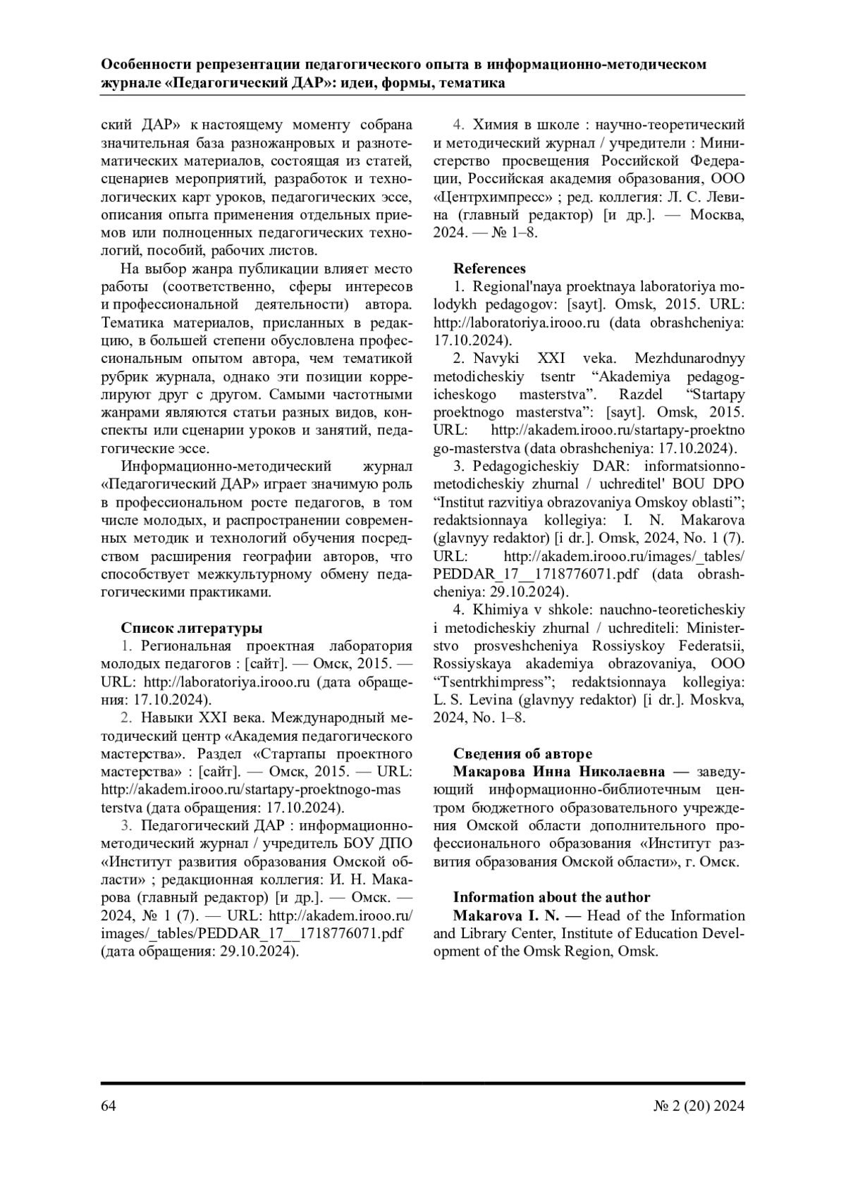 3. Педагогический ДАР: информационнометодический журнал / учредитель БОУ ДПО “Институт развития образования Омской области”; редакционная коллегия: И. Н. Макарова (главный редактор) [и др.]. - Омск. - 2024, № 1 (7). - URL: http://akadem.irooo.ru/images/_tables/PEDDAR_17__1718776071.pdf(дата обращения: 29.10.2024).