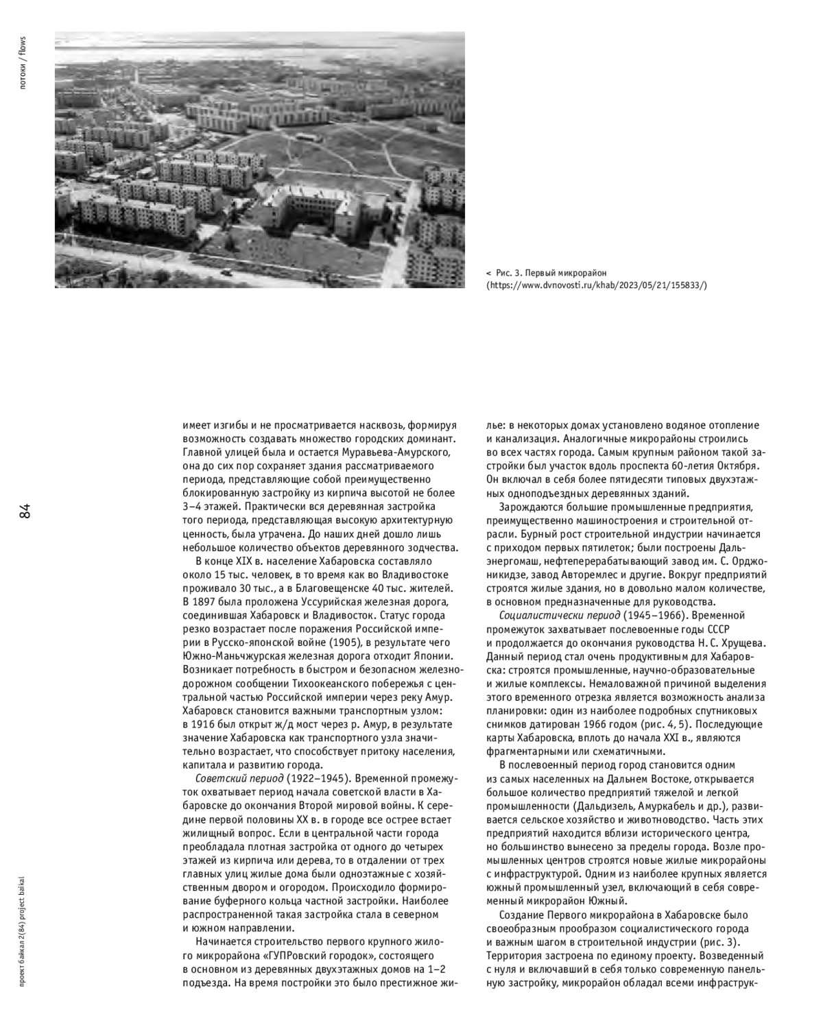 Введение. Планировочная структура Хабаровска была непосредственным элементом важных этапов модернизации отдельных районов, города и страны в целом. Все временные периоды наложили отпечаток на градостроительную картину города. Каждая функция – жилая, общественная, промышленная, административная и др. – несет в себе определенный уклад внутренних процессов, воплощаясь в градостроительный и архитектурный ансамбль, на многие десятилетия застывая в бетоне. Эти строительные массивы могут рассказать не только о логике городской коммуникации, но и дать представление об эффективности планировочной модели и создать прогнозы возможного дальнейшего развития населенного пункта.