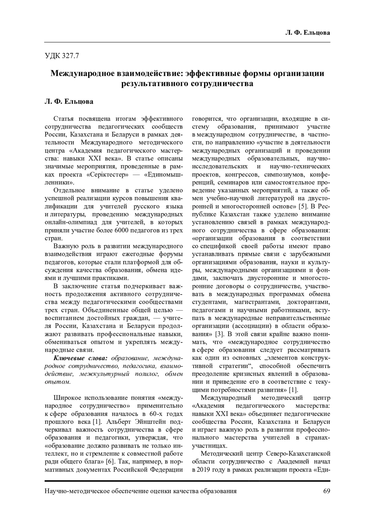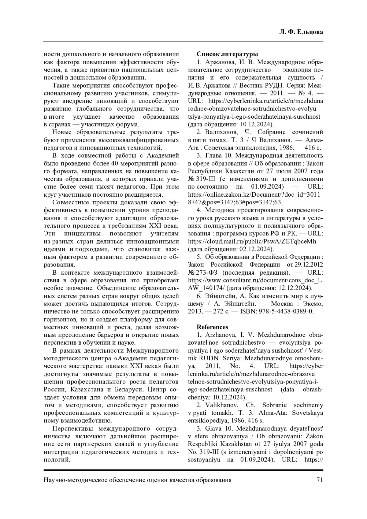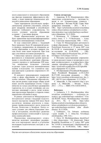 1. Аржанова, И. В. Международное образовательное сотрудничество - эволюция понятия и его содержательная сущность / И. В. Аржанова // Вестник РУДН. Серия: Международные отношения. - 2011. - № 4. EDN: OJZPFL