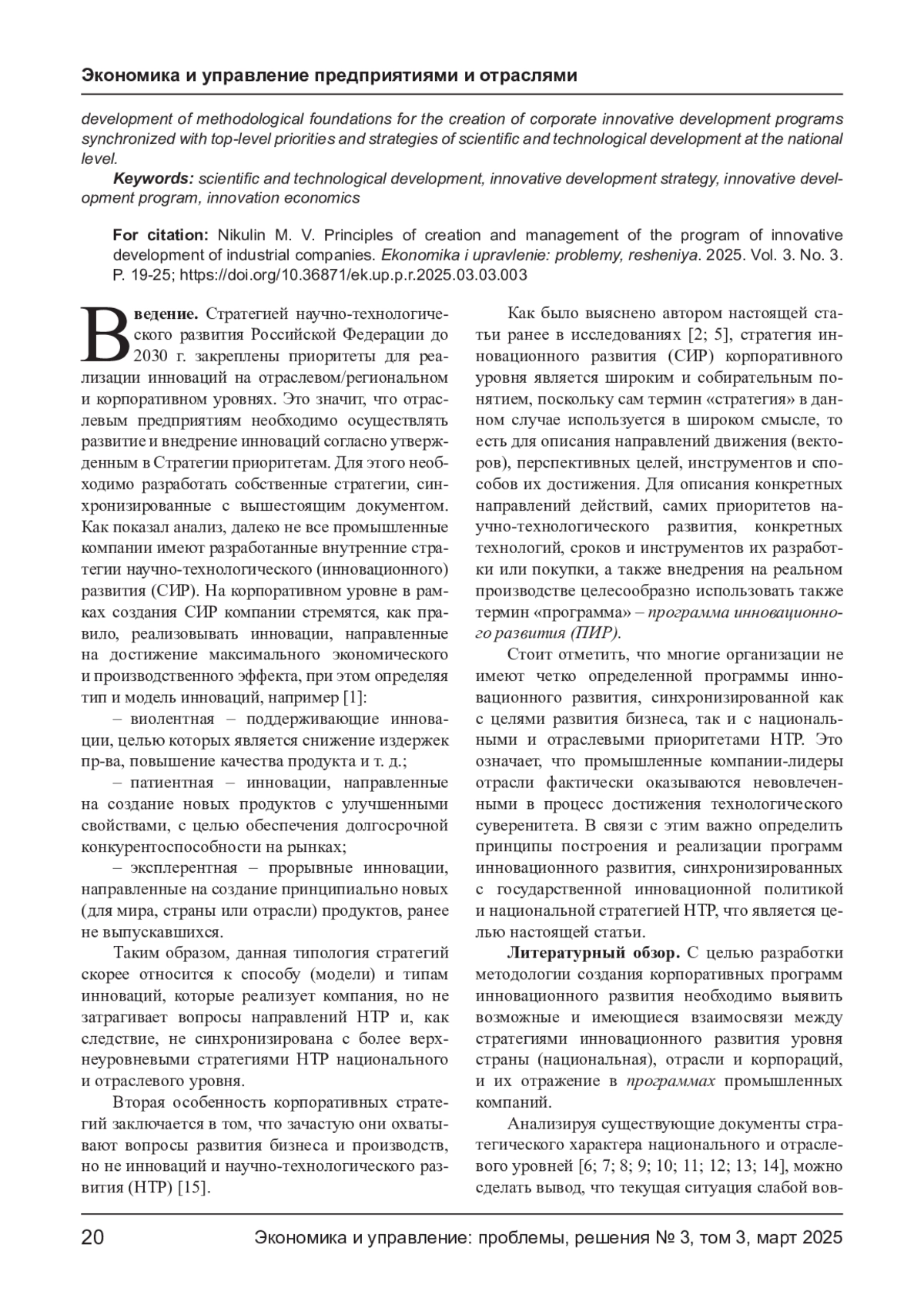 5. Никулин М. В., Горбашко Е. А. Методологические основы и принципы создания корпоративных стратегий инновационного развития промышленных компаний // Экономика и управление: проблемы, решения. - 2024. EDN: WXPLXY