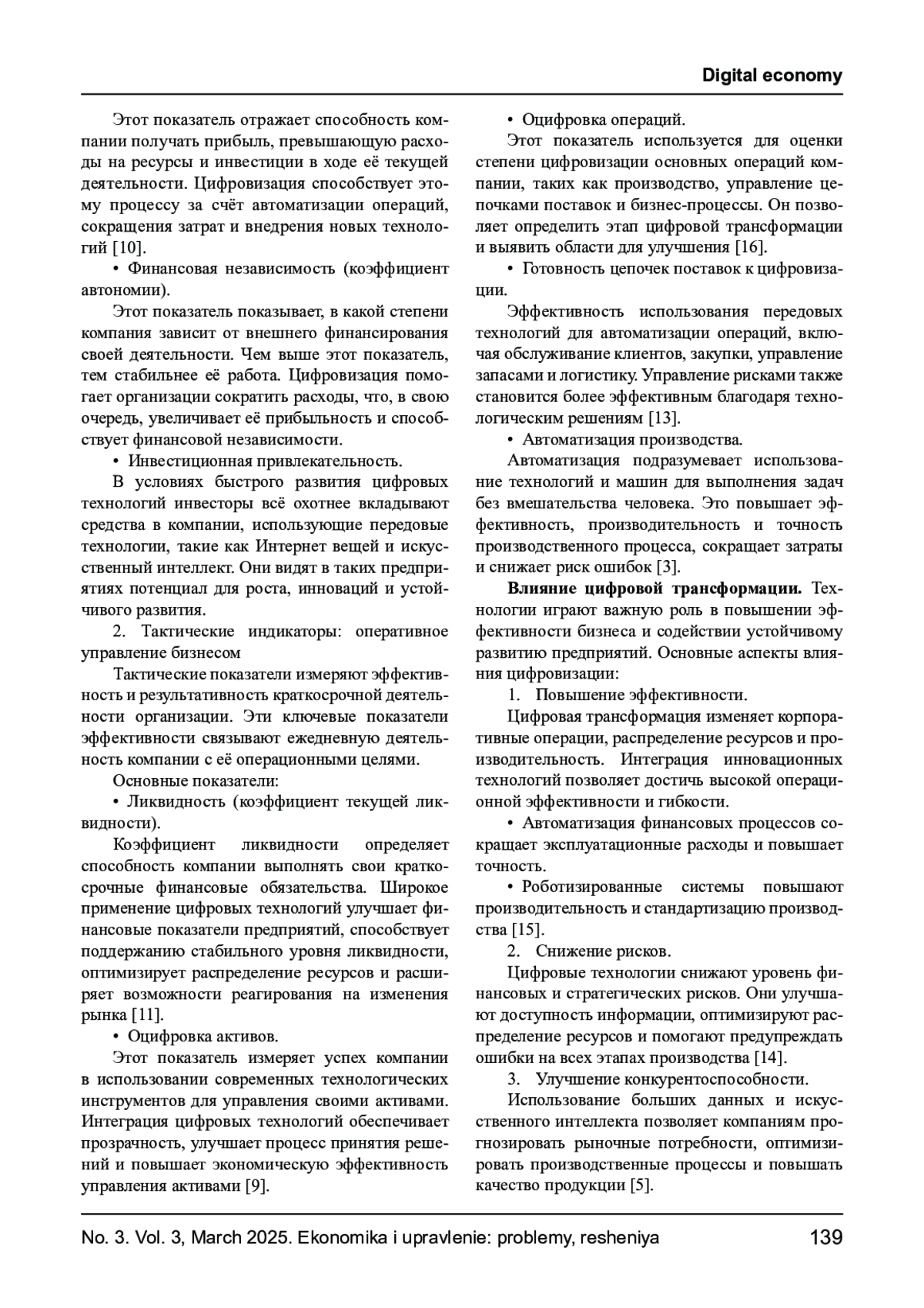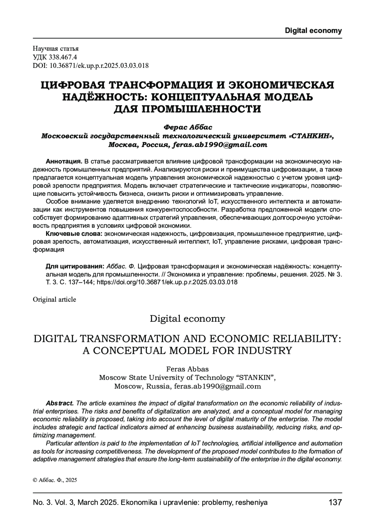 2. Васильев С. В., Николаев И. И. Интегрированная модель оценки экономической надежности предприятия в условиях цифровой трансформации // Современные проблемы экономики и управления. - 2024. - Т. 27, № 4. - С. 14-22.