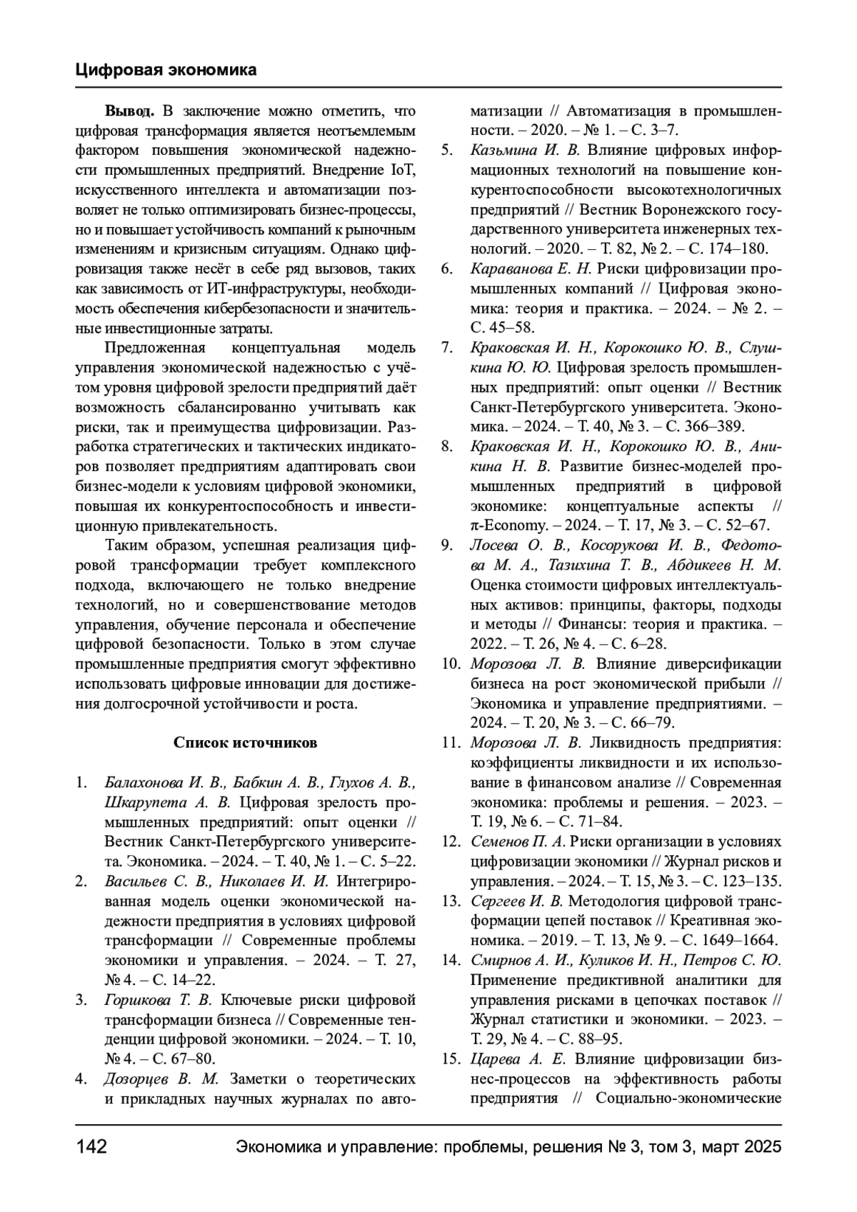 1. Балахонова И. В., Бабкин А. В., Глухов А. В., Шкарупета А. В. Цифровая зрелость промышленных предприятий: опыт оценки // Вестник Санкт-Петербургского университета. Экономика. - 2024. - Т. 40, № 1. - С. 5-22.