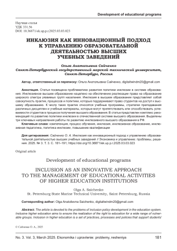 21. Korthals Altes T., Willemse M., Goei S. L., Ehren M. Higher education teachers’ understandings of and challenges for inclusion and inclusive learning environments: A systematic literature review // Educational Research Review. - 2024. - Vol. 43. DOI: 10.1016/j.edurev.2024.100605 EDN: UHVDJE