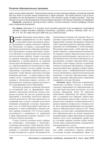 Статья посвящена проблематике развития политики инклюзии в системе образования. Инклюзивное высшее образование нацелено на обеспечение реализации права на образование широкого спектра уязвимых групп населения. Инклюзия в высшем образовании представляет собой совокупность практик, процессов и политики, которые поддерживают право студентов на доступ к высшему образованию. К числу таких практик относятся учебные программы, стратегии преподавания различных дисциплин и учебные материалы, которые могут препятствовать или способствовать успеваемости студентов в процессе получения высшего образования. В статье представлен комплекс рекомендаций по развитию политики инклюзии в отечественной системе высшего образования. Выделены три ключевых направления работы по развитию инклюзивного высшего образования в РФ.