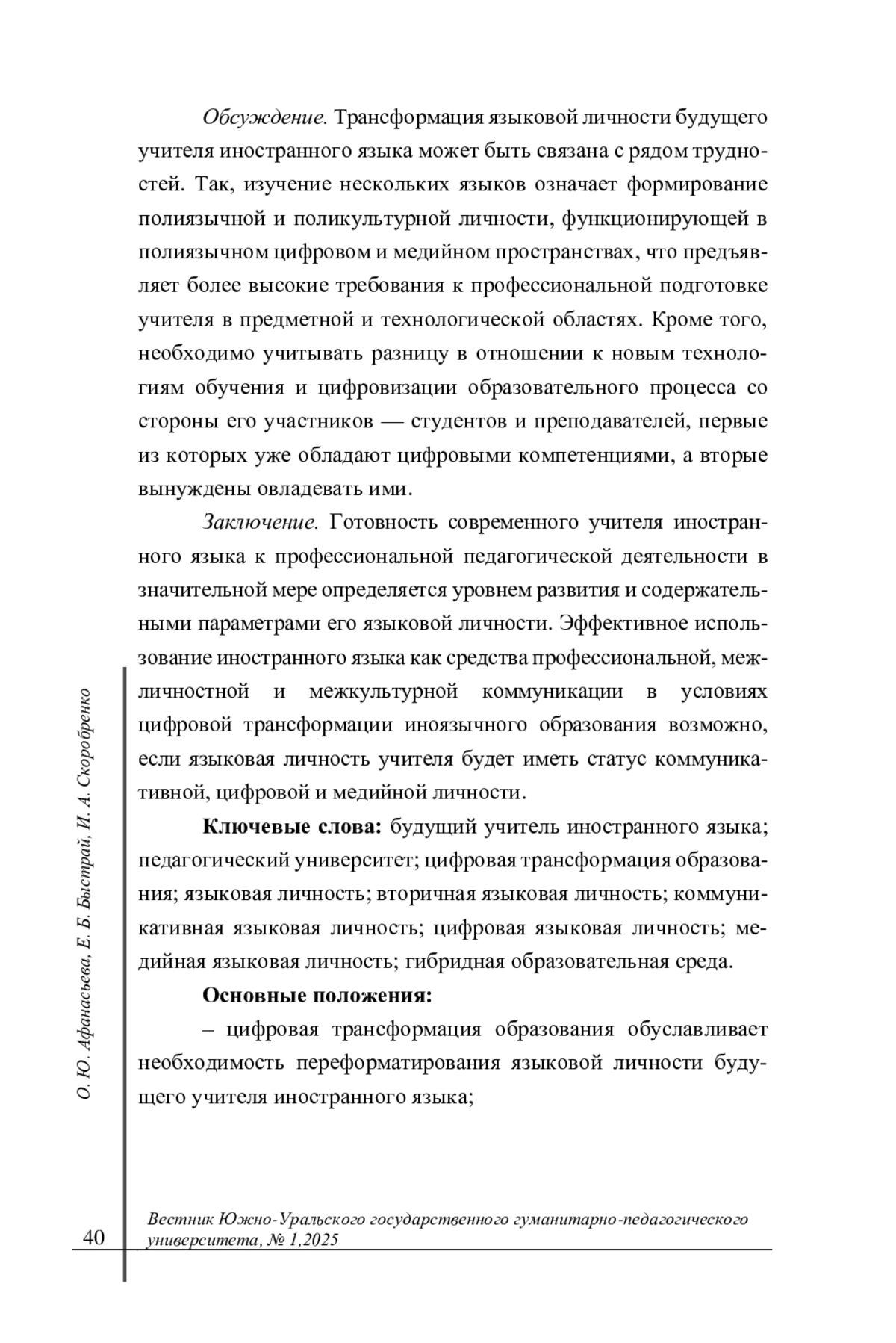 Заключение. Готовность современного учителя иностранного языка к профессиональной педагогической деятельности в значительной мере определяется уровнем развития и содержательными параметрами его языковой личности. Эффективное использование иностранного языка как средства профессиональной, межличностной и межкультурной коммуникации в условиях цифровой трансформации иноязычного образования возможно, если языковая личность учителя будет иметь статус коммуникативной, цифровой и медийной личности. Основные положения: - цифровая трансформация образования обуславливает необходимость переформатирования языковой личности будущего учителя иностранного языка; - переформатирование языковой личности будущего учителя иностранного языка идет в русле коммуникативного, цифрового и медийного треков.