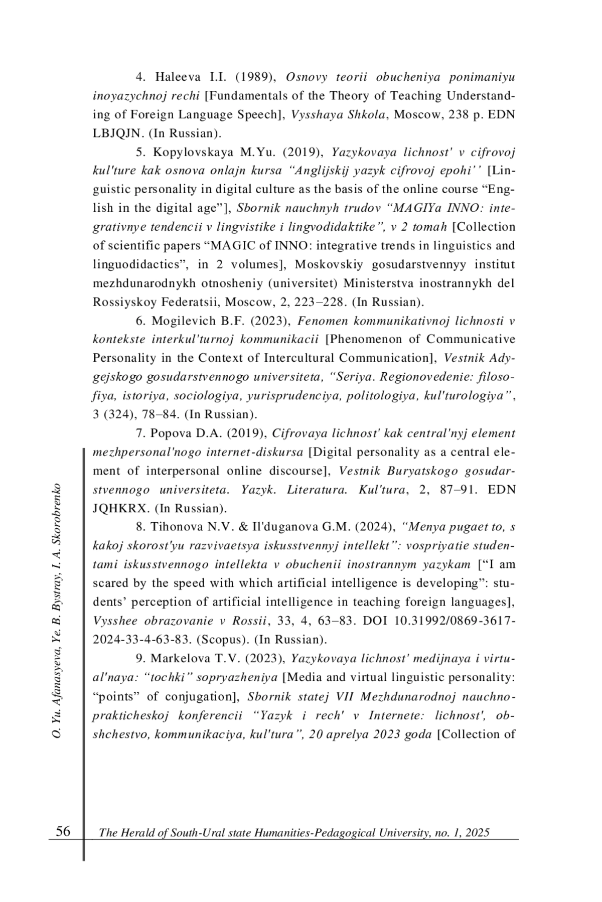 8. Тихонова Н. В., Ильдуганова Г. М. “Меня пугает то, с какой скоростью развивается искусственный интеллект”: восприятие студентами искусственного интеллекта в обучении иностранным языкам // Высшее образование в России. 2024. Т. 33, № 4. С. 63-83. 10.31992/0869-3617-2024-33-4-63-83. (Scopus). DOI: 10.31992/0869-3617-2024-33-4-63-83.(Scopus) EDN: FNUAVR