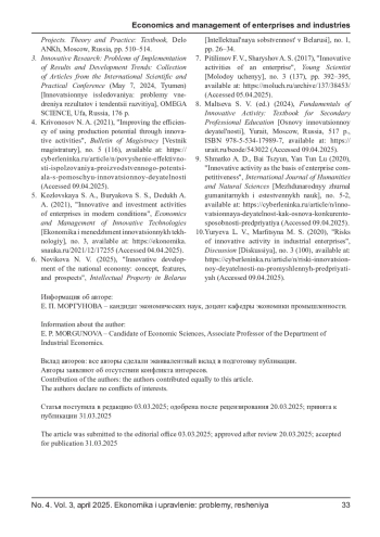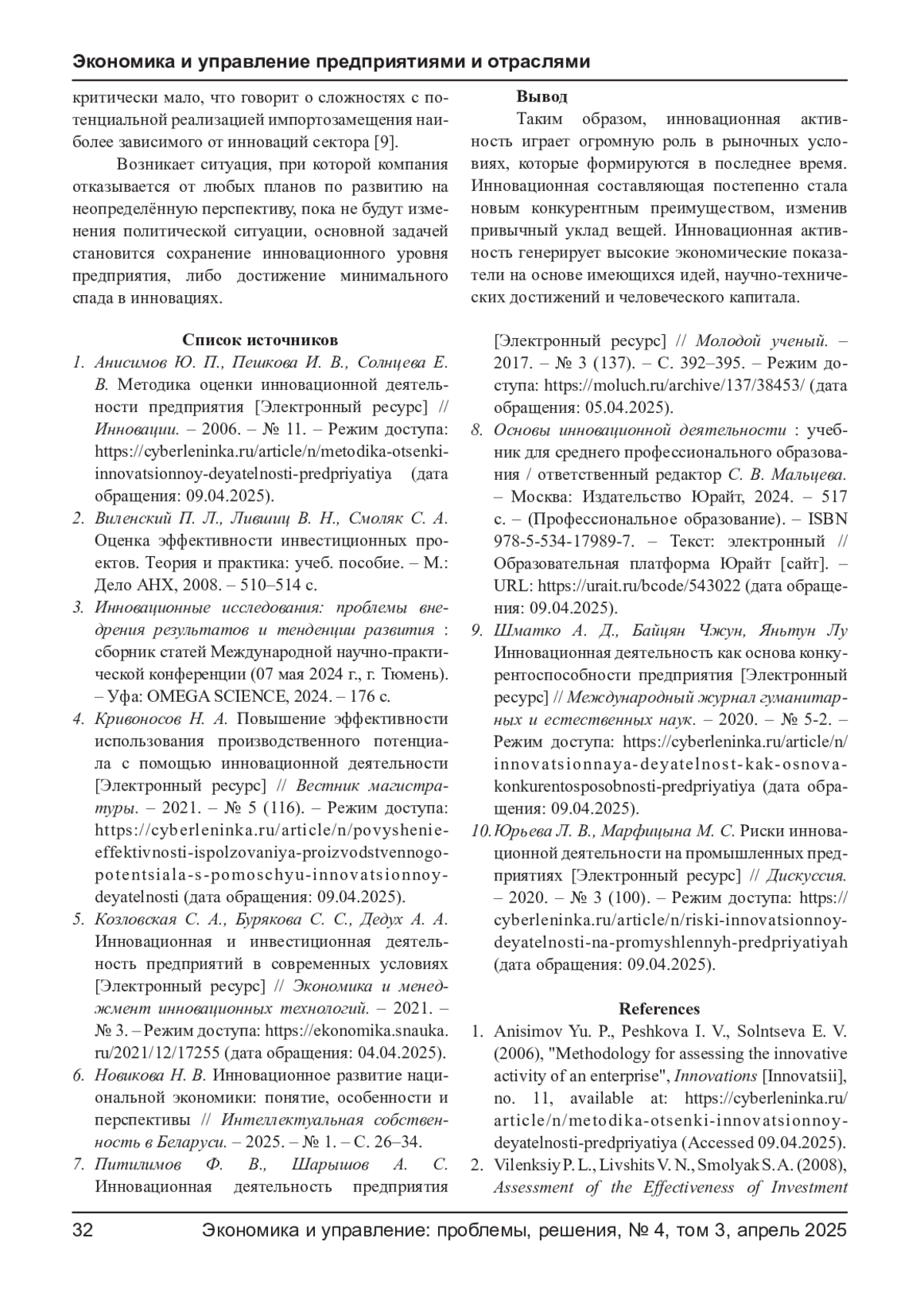 7. Питилимов Ф. В., Шарышов А. С. Инновационная деятельность предприятия [Электронный ресурс] // Молодой ученый. - 2017. - № 3 (137). - С. 392-395. - Режим доступа: https://moluch.ru/archive/137/38453/(дата обращения: 05.04.2025). EDN: XQZEUL