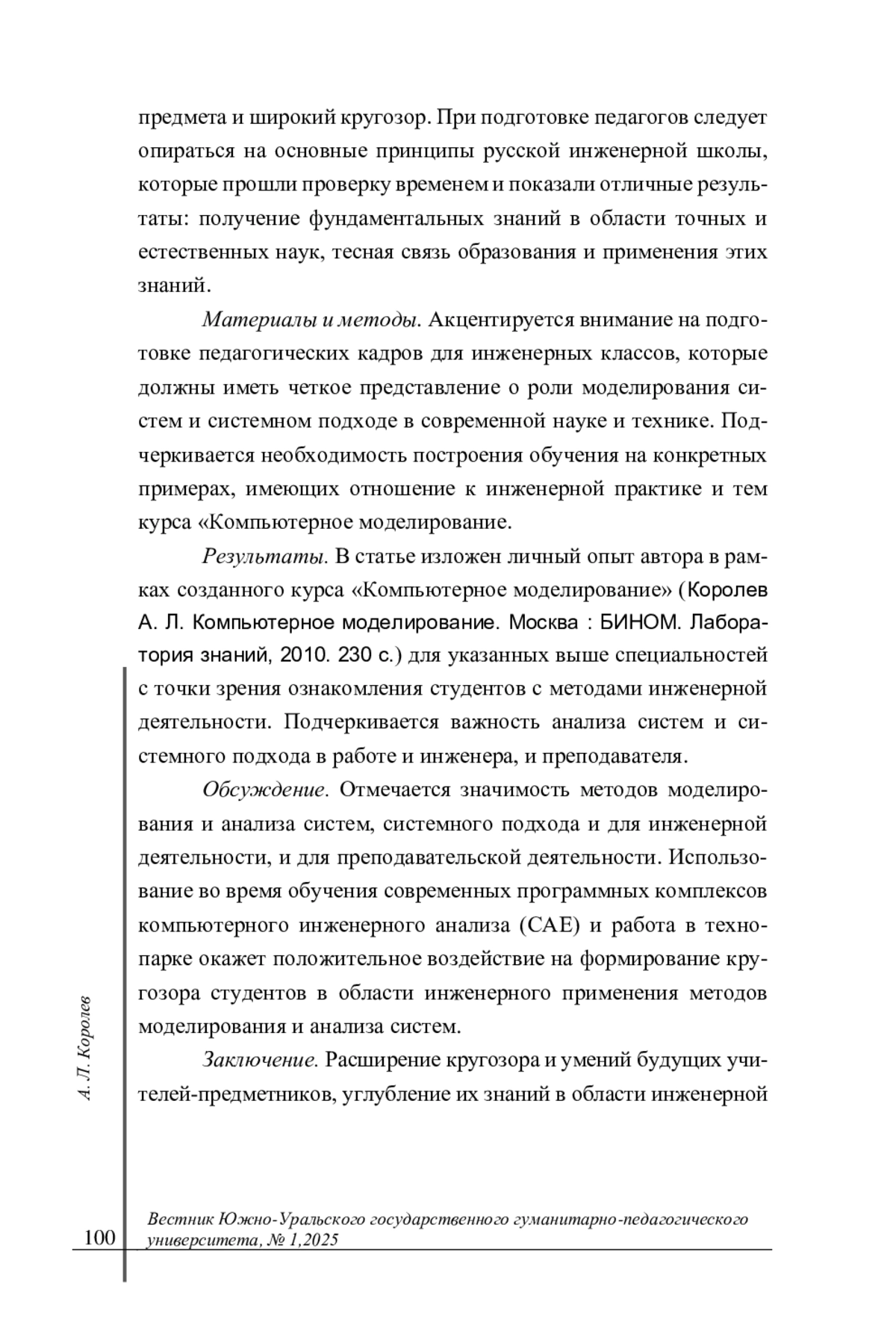 Результаты. В статье изложен личный опыт автора в рамках созданного курса «Компьютерное моделирование» (Королев А. Л. Компьютерное моделирование. Москва: БИНОМ. Лаборатория знаний, 2010. 230 с.) для указанных выше специальностей с точки зрения ознакомления студентов с методами инженерной деятельности. Подчеркивается важность анализа систем и системного подхода в работе и инженера, и преподавателя.