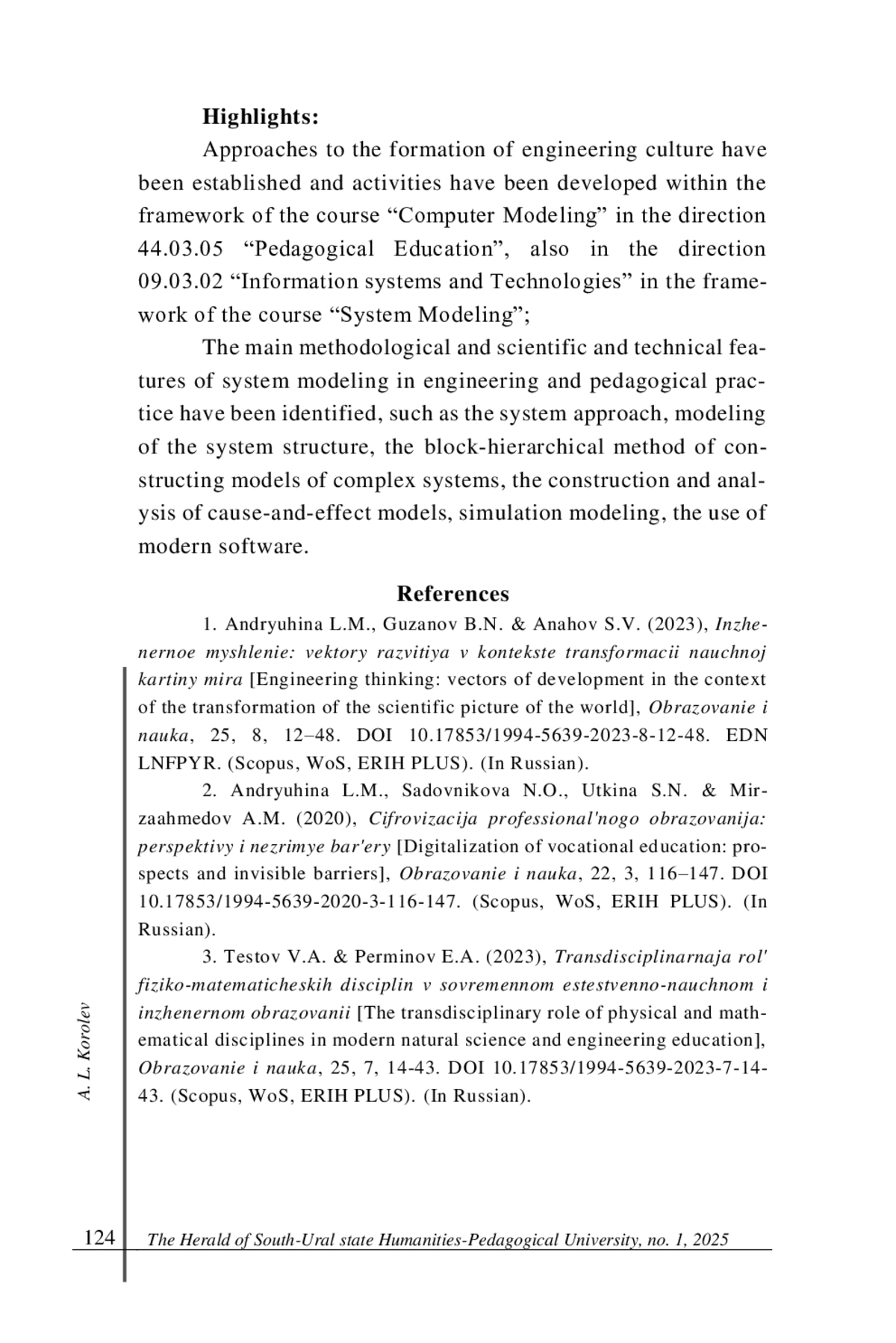 1. Андрюхина Л. М., Гузанов Б. Н., Анахов С. В. Инженерное мышление: векторы развития в контексте трансформации научной картины мира // Образование и наука. 2023. Т. 25, № 8. С. 12-48. 10.17853/1994-5639-2023-8-12-48. (Scopus, WoS, ERIH PLUS). DOI: 10.17853/1994-5639-2023-8-12-48.Scopus EDN: LNFPYR