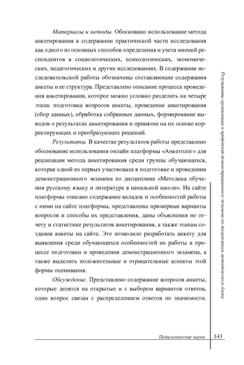 Результаты. В качестве результатов работы представлено обоснование использования онлайн платформы «Анкетолог» для реализации метода анкетирования среди группы обучающихся, которая одной из первых участвовала в подготовке и проведении демонстрационного экзамена по дисциплине «Методика обучения русскому языку и литературе в начальной школе». На сайте платформы описано содержание вкладок и особенностей работы с ними на сайте платформы, представлены примерные варианты вопросов и способы их представления, даны объяснения по отчету и статистике результатов анкетирования, а также этапам создания анкеты на сайте. Это позволило разработать анкету для выявления среди обучающихся особенностей их работы в процессе подготовки и проведения демонстрационного экзамена, а также выделить положительные и отрицательные аспекты этой формы оценивания.