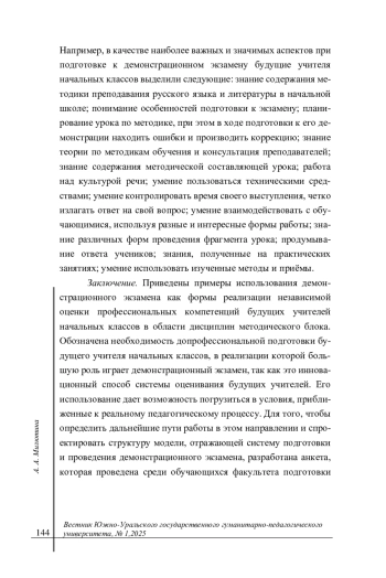 Заключение. Отражена система подготовки и проведения демонстрационного экзамена по дисциплинам методического блока и обоснована профессиональная направленность внедрения этой формы оценивания в систему независимой оценки профессиональных компетенций будущих учителей начальных классов. Рассмотрена роль информационно-деятельностного подхода при проектировании модели и его связи с системой оценивания обучающихся, отражена его роль в формировании профессиональных компетенций педагога. Основные положения: - обоснована необходимость независимой оценки достигнутых студентами профессиональных компетенций по дисциплинам методического блока; - обозначены некоторые результаты анкетирования обучающихся в рамках исследования; - описаны этапы подготовки и проведения демонстрационного экзамена по дисциплинам методического блока.