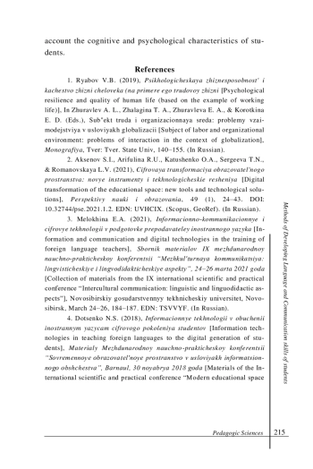 3. Мелёхина Е. А. Информационно-коммуникационные и цифровые технологии в подготовке преподавателей иностранного языка // Межкультурная коммуникация: лингвистические и лингводидактические аспекты: сборник материалов IX международной научно-практической конференции. Новосибирск, 24-26 марта 2021 года. Новосибирск: Новосибирский государственный технический университет, 2021. С. 184-187. EDN: TSVVYF