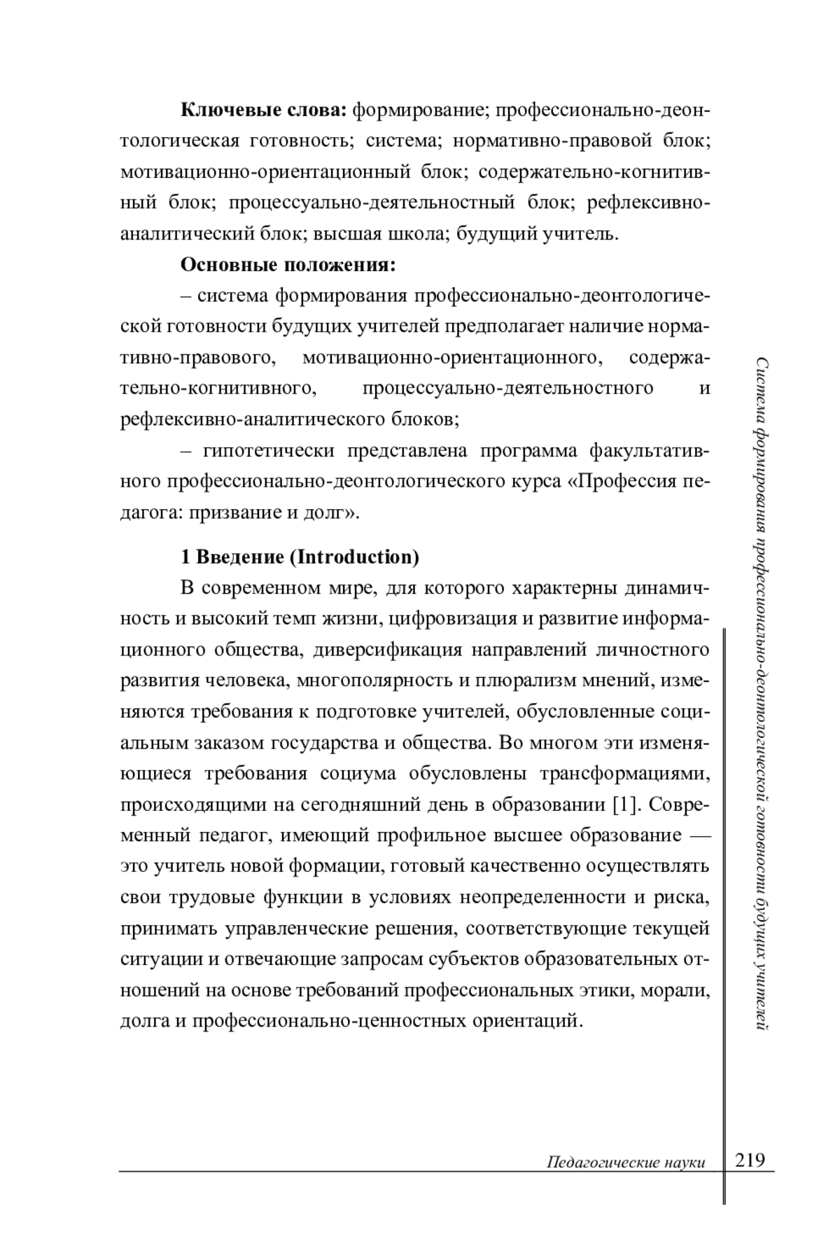 Результаты. Автором обоснована необходимость разработки системы формирования профессионально-деонтологической готовности будущих учителей, а также представлено содержание данной системы. Также автором представлено содержание модулей программы факультативного профессионально-деонтологического курса «Профессия педагога: призвание и долг», реализуемого в образовательном процессе вуза.