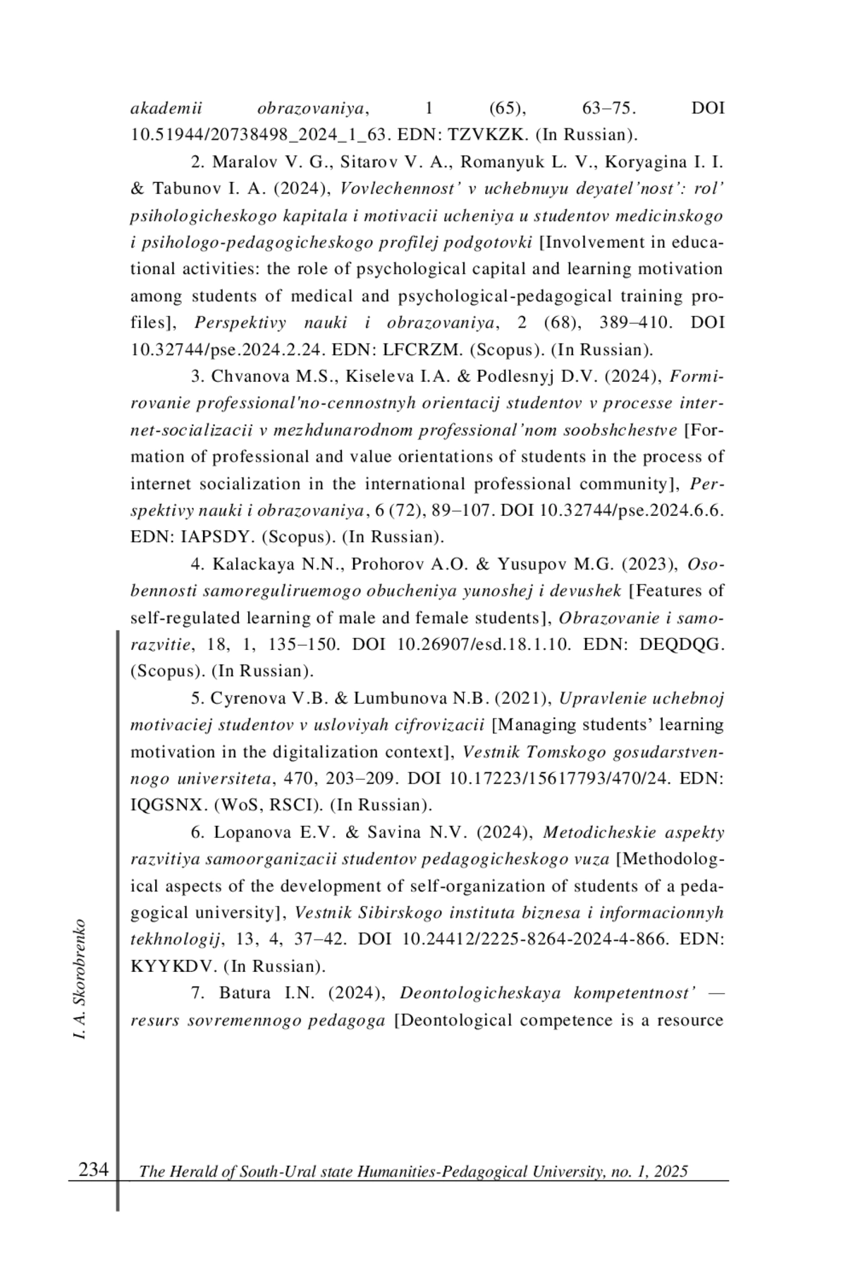 2. Маралов В. Г., Ситаров В. А., Романюк Л. В., Корягина И. И., Табунов И. А. Вовлеченность в учебную деятельность: роль психологического капитала и мотивации учения у студентов медицинского и психолого-педагогического профилей подготовки // Перспективы науки и образования. 2024. № 2 (68). С. 389-410. 10.32744/pse.2024.2.24. (Scopus). DOI: 10.32744/pse.2024.2.24.Scopus EDN: LFCRZM