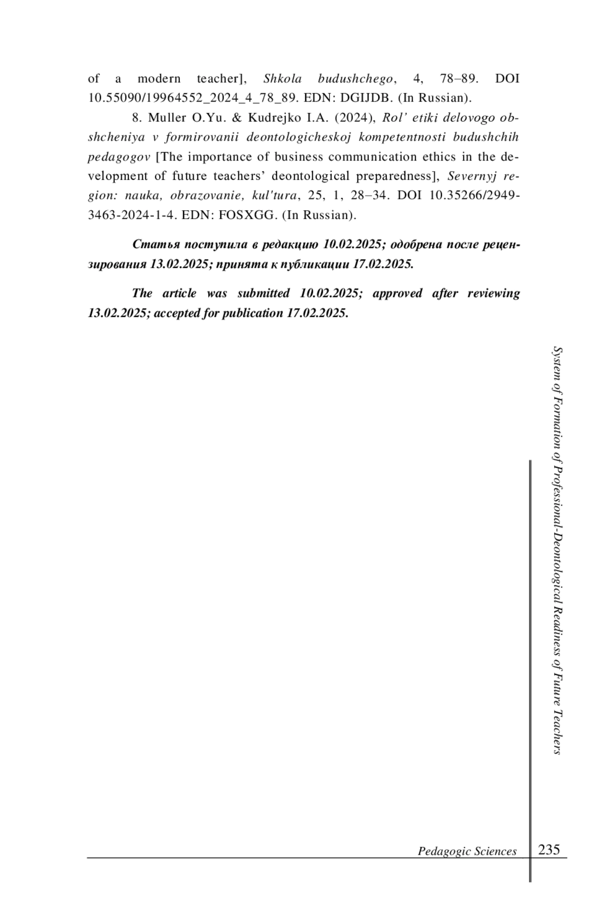 8. Муллер О. Ю., Кудрейко И. А. Роль этики делового общения в формировании деонтологической компетентности будущих педагогов // Северный регион: наука, образование, культура. 2024. Т. 25, № 1. С. 28-34. DOI: 10.35266/2949-3463-2024-1-4 EDN: FOSXGG