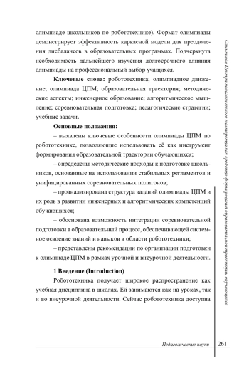 Заключение. Внедрение олимпиады ЦПМ в образовательный процесс способствует не только формированию устойчивых образовательных траекторий, но и развитию навыков, релевантных для участия в других соревнованиях (например, Московской олимпиаде школьников по робототехнике). Формат олимпиады демонстрирует эффективность каркасной модели для преодоления дисбалансов в образовательных программах. Подчеркнута необходимость дальнейшего изучения долгосрочного влияния олимпиады на профессиональный выбор учащихся. Основные положения: - выявлены ключевые особенности олимпиады ЦПМ по робототехнике, позволяющие использовать её как инструмент формирования образовательной траектории обучающихся; - определены методические подходы к подготовке школьников, основанные на использовании стабильных регламентов и унифицированных соревновательных полигонов; - проанализирована структура заданий олимпиады ЦПМ и их роль в развитии инженерных и алгоритмических компетенций обучающихся; - обоснована возможность интеграции соревновательной подготовки в образовательный процесс, обеспечивающей системное освоение знаний и навыков в области робототехники; - представлены рекомендации по организации подготовки к олимпиаде ЦПМ в рамках урочной и внеурочной деятельности.