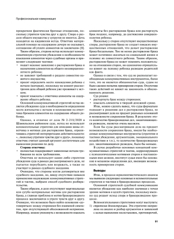 Результаты. В процессе юрислингвистического анализа мы выявили основные и вспомогательные стратегии и тактики в бракоразводных процессах. Основной стратегией судебной коммуникации является убеждение как наиболее значимая с точки зрения мотивов и целей стратегия, поскольку именно суд решает исход спора в бракоразводном процессе. Вспомогательными стратегиями выступают стратегия деконструкции, стратегия интерпретации действительности, эмоционально-настраивающая стратегия, риторическая стратегия, диалоговая стратегия и др. Коммуникативно-психологическими мотивами расторжения брака могут выступать утрата интереса супругов (коммуникативные конфликты, непонимание, равнодушие, агрессия), неверность, побои, отсутствие ухода за совместными детьми и многое др. Считаем необходимым разработку специальной юрислингвистической методики, использующей коммуникативно-дискурсивный потенциал, которая бы Заявляла строгий механизм учета мотивов действий всех сторон и реализовала бы алгоритм коррелирующих коммуникативных тактик и стратегий в целях успешного примирения сторон. Научная новизна исследования состоит в обращении к юрислингвистическому дискурсу бракоразводных процессов в целях выявления коммуникативных тактик и стратегий как базе разработки юрислингвистической методики, использующей коммуникативно-дискурсивный потенциал.