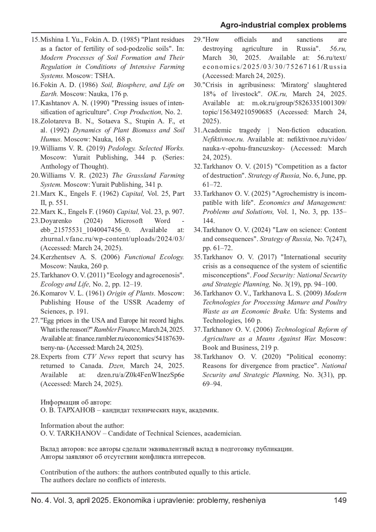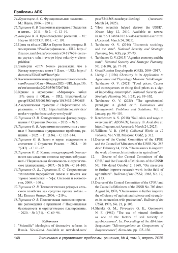 8. Тарханов О. В. Агрохимическая парадигма: как мировое зло // Экономика и управление: проблемы, решения. - 2025. - Т. 1. - С. 96-110. EDN: OYFLCG