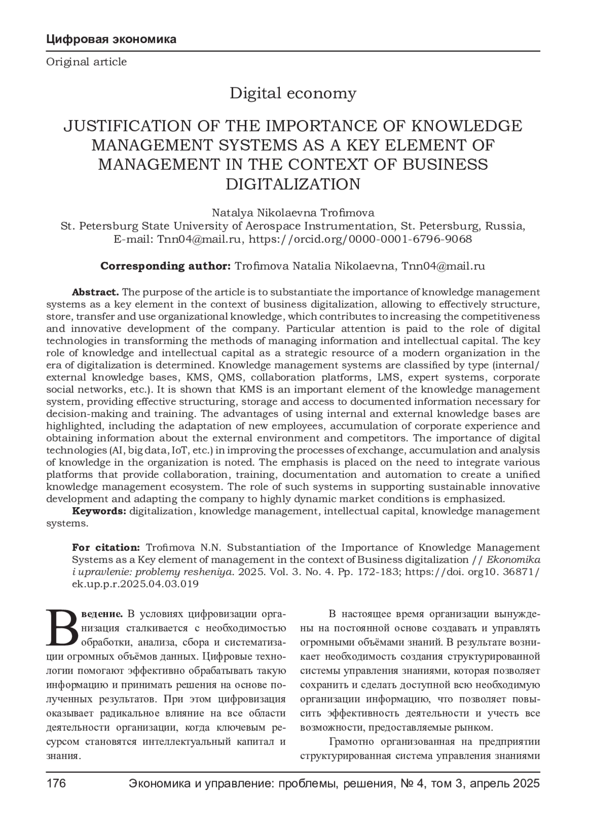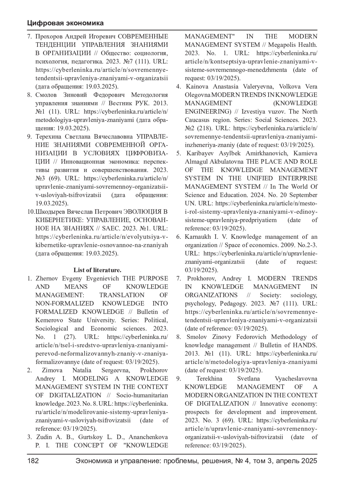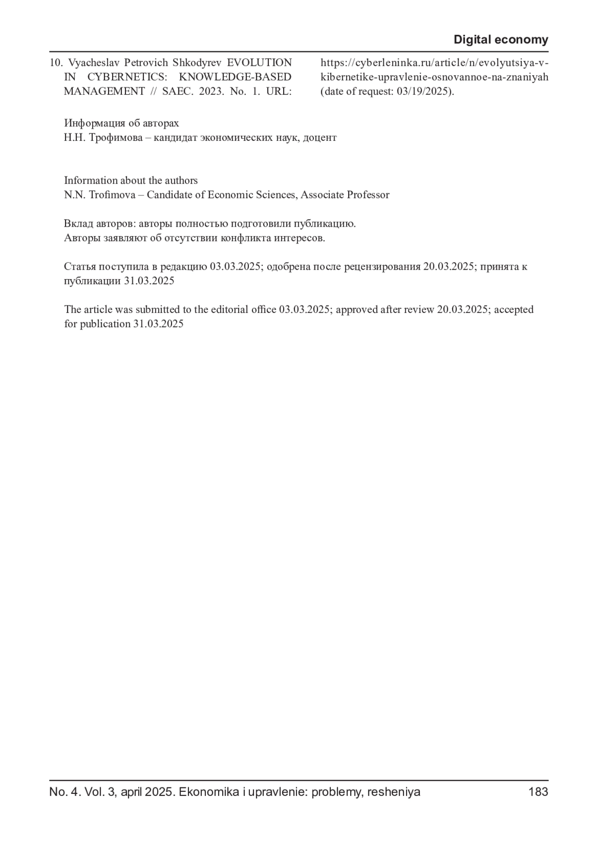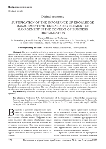 ТРОФИМОВА Н. Н. ОБОСНОВАНИЕ ЗНАЧИМОСТИ СИСТЕМ УПРАВЛЕНИЯ ЗНАНИЯМИ КАК КЛЮЧЕВОГО ЭЛЕМЕНТА УПРАВЛЕНИЯ В УСЛОВИЯХ ЦИФРОВИЗАЦИИ БИЗНЕСА // ЭКОНОМИКА И УПРАВЛЕНИЕ: ПРОБЛЕМЫ, РЕШЕНИЯ. 2025. ТОМ 3 № 4