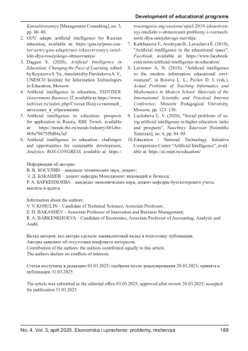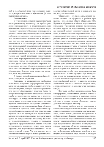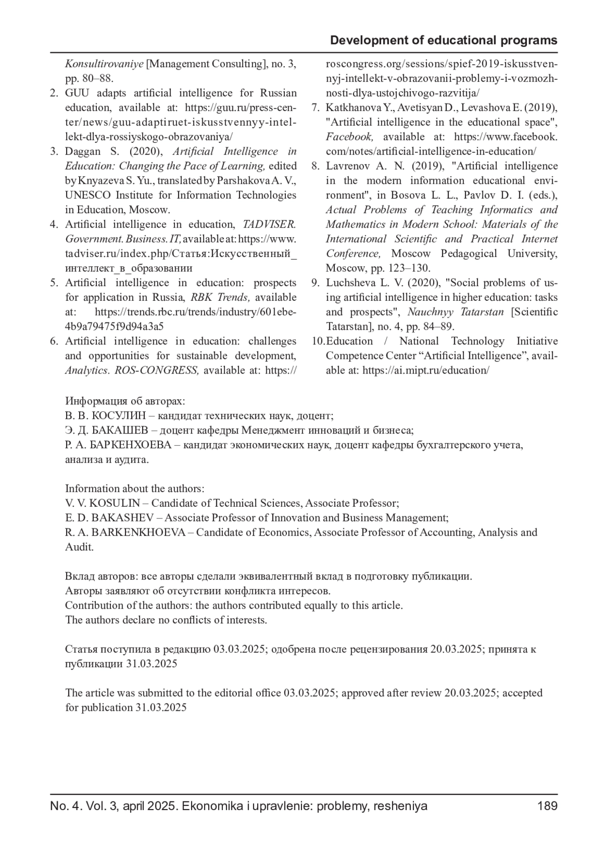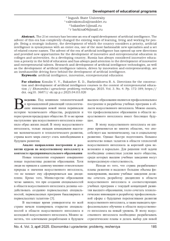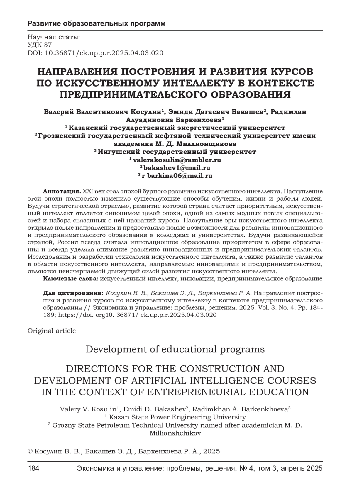 КОСУЛИН В. В., БАКАШЕВ Э. Д., БАРКЕНХОЕВА Р. А. НАПРАВЛЕНИЯ ПОСТРОЕНИЯ И РАЗВИТИЯ КУРСОВ ПО ИСКУССТВЕННОМУ ИНТЕЛЛЕКТУ В КОНТЕКСТЕ ПРЕДПРИНИМАТЕЛЬСКОГО ОБРАЗОВАНИЯ // ЭКОНОМИКА И УПРАВЛЕНИЕ: ПРОБЛЕМЫ, РЕШЕНИЯ. 2025. ТОМ 3 № 4