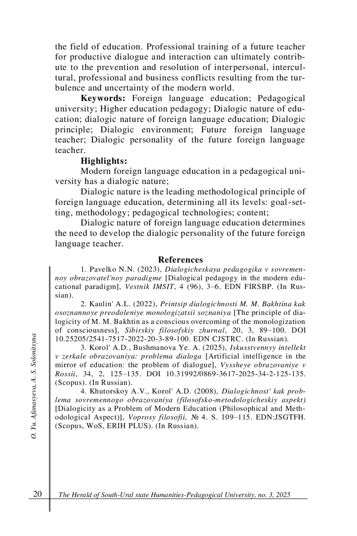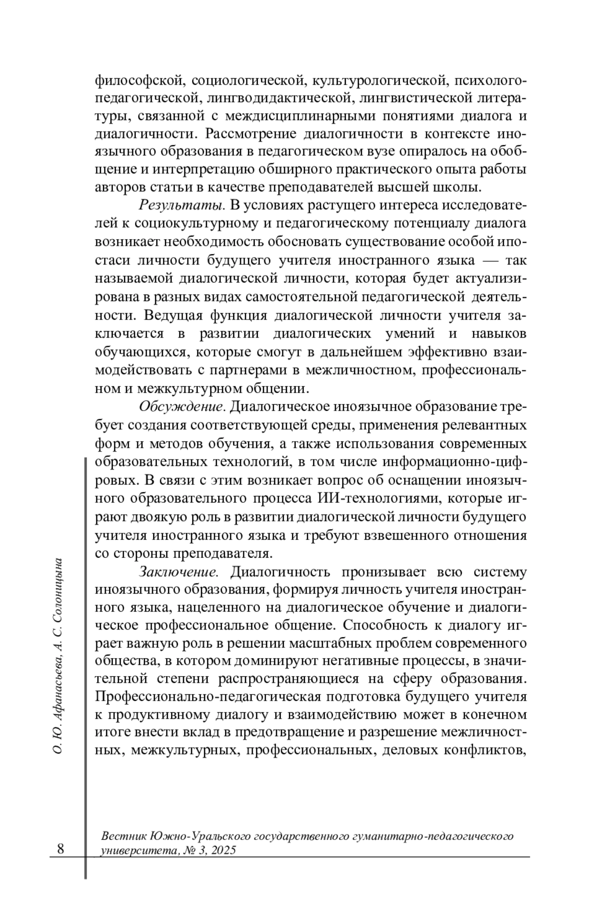 3. Король А. Д., Бушманова Е. А. Искусственный интеллект в зеркале образования: проблема диалога // Высшее образование в России. 2025. Т. 34, № 2. С. 125-135. 10.31992/0869-3617-2025-34-2-125-135. (Scopus). DOI: 10.31992/0869-3617-2025-34-2-125-135.(Scopus) EDN: PBTQXG