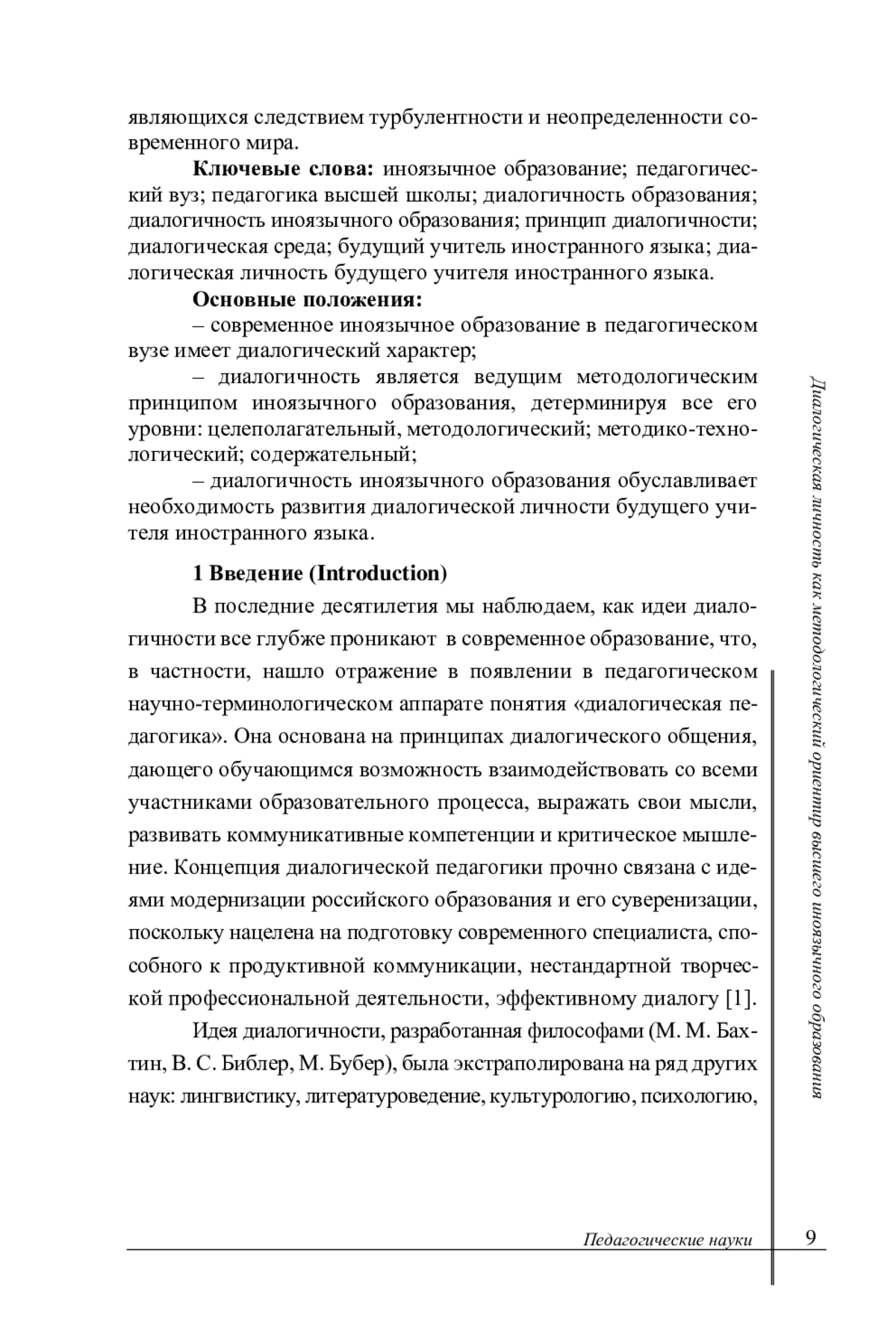 Введение. В настоящее время гуманитарное знание постоянно обращается к проблеме диалогичности, которая находит отражение в различных областях знания, а в последние годы - и в педагогических науках. Многие специалисты в области иноязычного образования утверждают, что диалогичность представляет собой ведущий методологический принцип, который призван детерминировать основные аспекты образовательного процесса в высшей школе: целеполагание, содержание, методико-технологическое обеспечение и т. д. Цель статьи - определить роль диалогичности в иноязычном образовании в педагогическом вузе при подготовке будущего учителя иностранного языка.