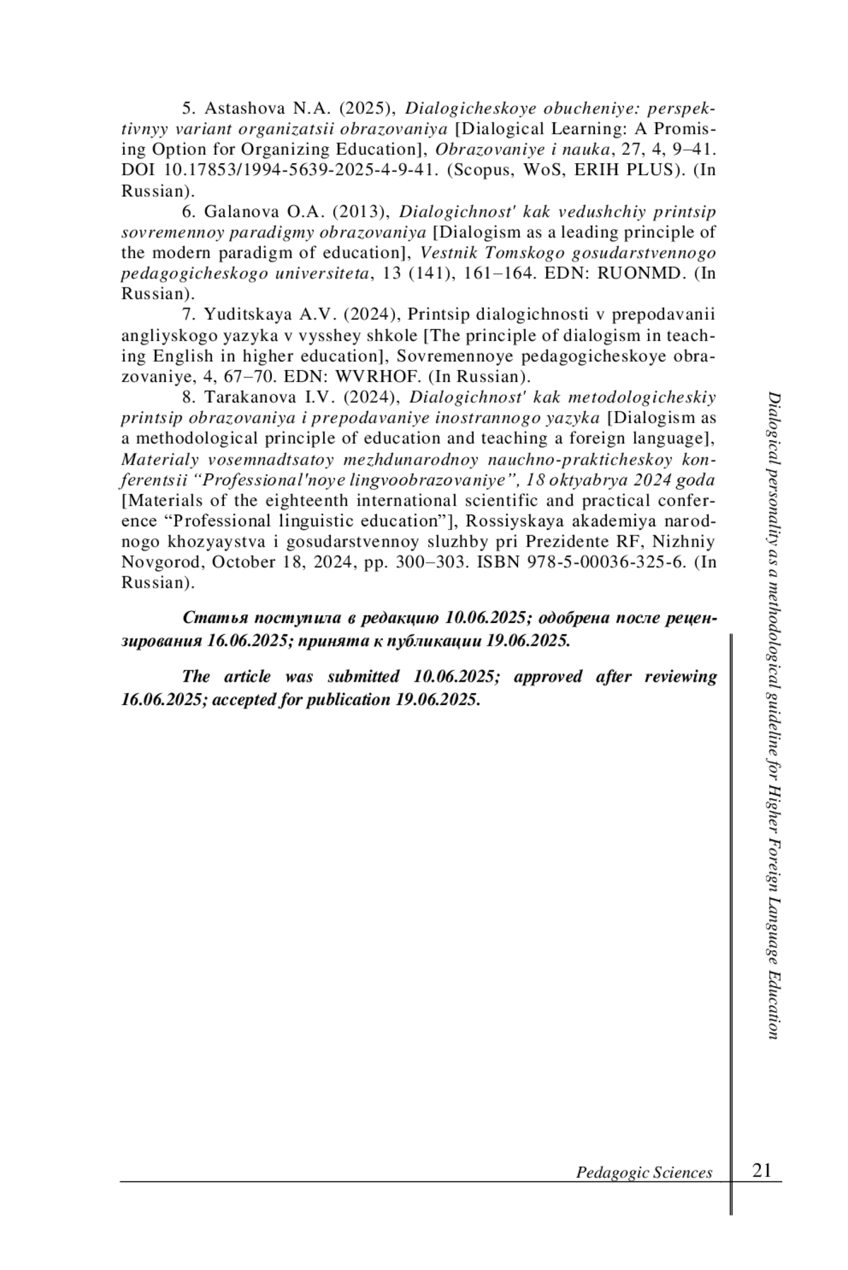 5. Асташова Н. А. Диалогическое обучение: перспективный вариант организации образования // Образование и наука. 2025. Т. 27, № 4. С. 9-41. 10.17853/1994-5639-2025-4-9-41. (Scopus, WoS, ERIH PLUS). DOI: 10.17853/1994-5639-2025-4-9-41.(Scopus EDN: FAVMHJ