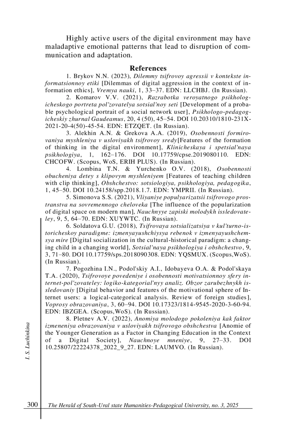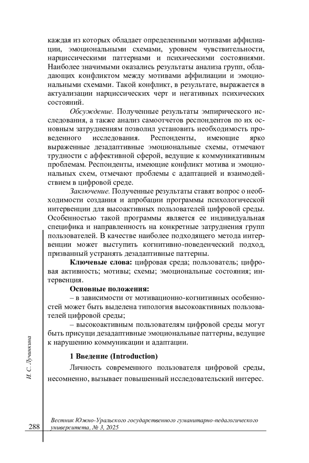 ЛУЧИНКИНА И. С. ТИПОЛОГИЯ АКТИВНЫХ ПОЛЬЗОВАТЕЛЕЙ ЦИФРОВОЙ СРЕДЫ С УЧЕТОМ ИХ МОТИВАЦИОННО-АФФЕКТИВНЫХ ОСОБЕННОСТЕЙ // ВЕСТНИК ЮЖНО-УРАЛЬСКОГО ГОСУДАРСТВЕННОГО ГУМАНИТАРНО-ПЕДАГОГИЧЕСКОГО УНИВЕРСИТЕТА. 2025. № 3 (187)