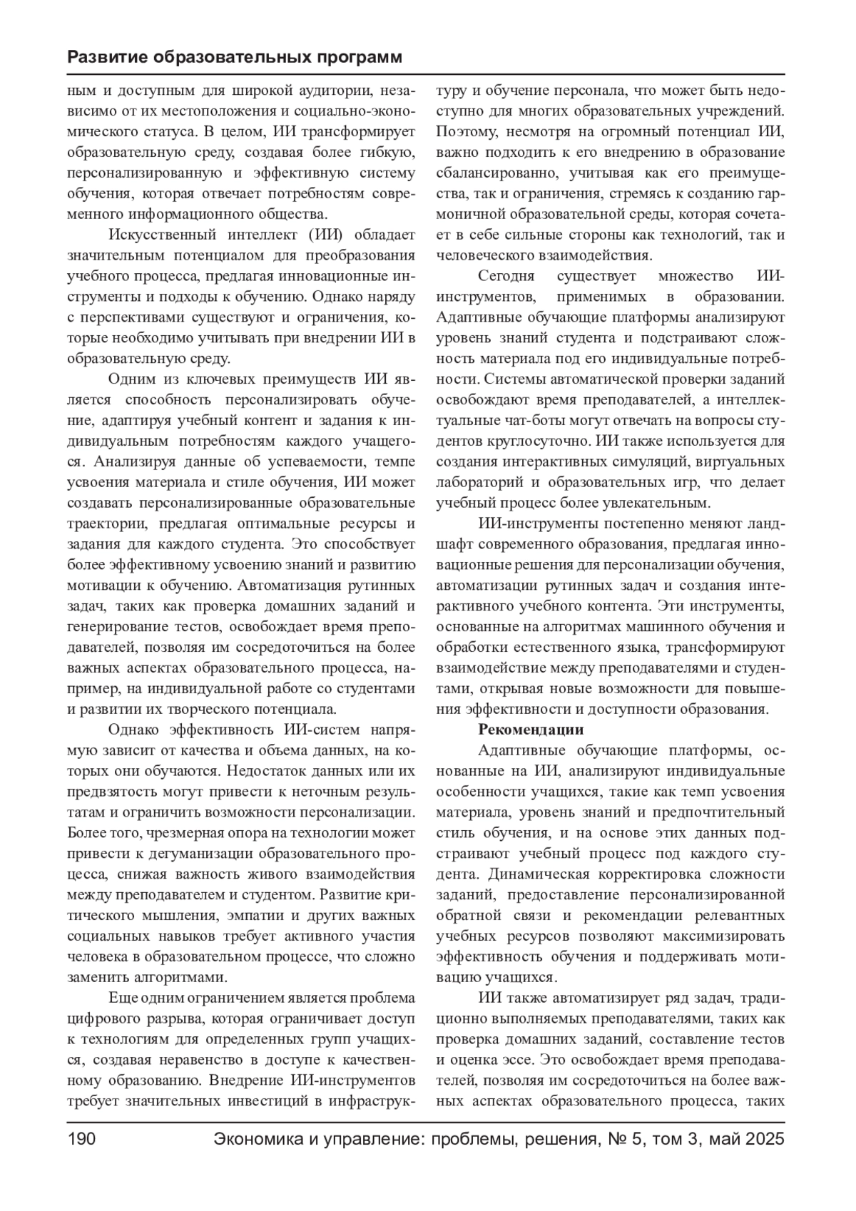 Современная образовательная система претерпевает значительные трансформации под влиянием стремительно развивающихся технологий, в частности, искусственного интеллекта (ИИ). ИИ проникает во все сферы образовательной деятельности, предлагая новые инструменты и подходы к обучению.