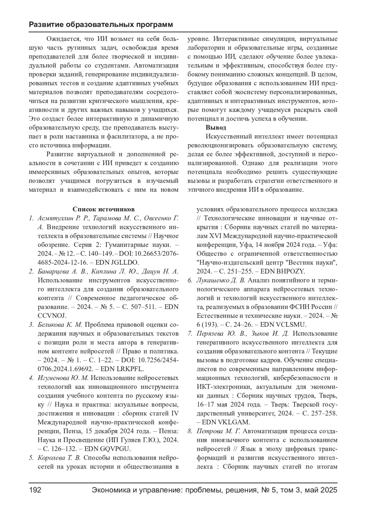 1. Асмятуллин Р. Р., Тарамова М. С., Овсеенко Г. А. Внедрение технологий искусственного интеллекта в образовательные системы // Научное обозрение. Серия 2: Гуманитарные науки. - 2024. - № 12. - С. 140-149. -. DOI: 10.26653/20764685-2024-12-16 EDN: JGLLDO