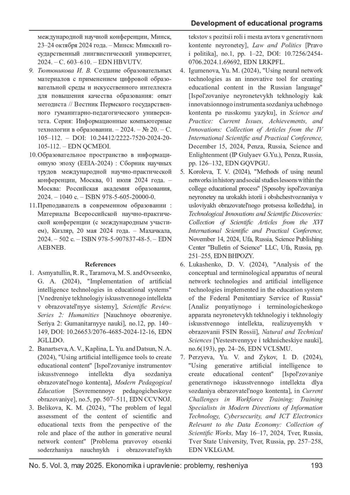 7. Перязева Ю. В., Зыков И. Д. Использование генеративного искусственного интеллекта для создания образовательного контента // Текущие вызовы в подготовке кадров. Обучение специалистов по современным направлениям информационных технологий, кибербезопасности и ИКТ-электроники, актуальным для экономики данных: Сборник научных трудов, Тверь, 16-17 мая 2024 года. - Тверь: Тверской государственный университет, 2024. - С. 257-258. EDN: VKLGAM