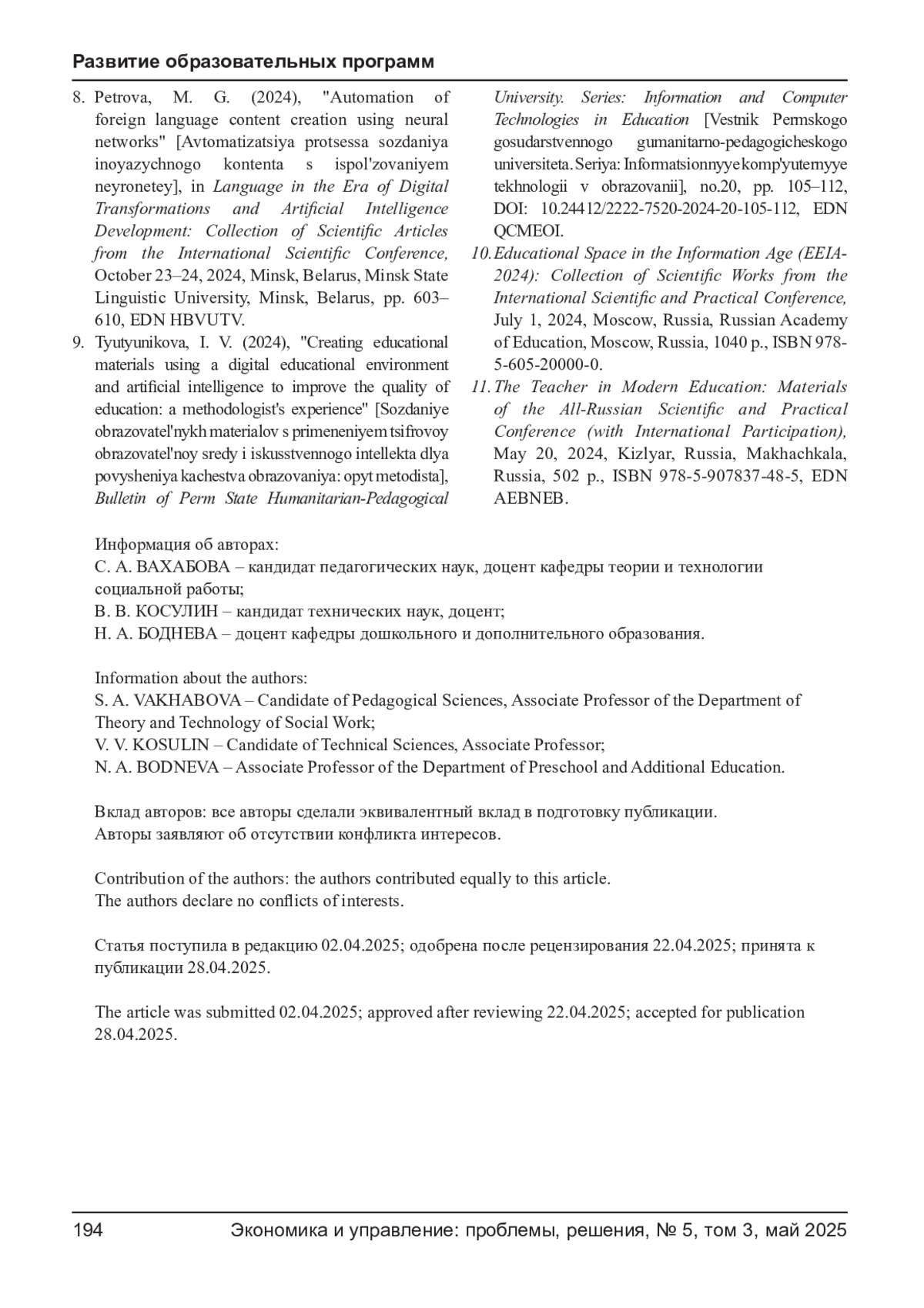 9. Тютюникова И. В. Создание образовательных материалов с применением цифровой образовательной среды и искусственного интеллекта для повышения качества образования: опыт методиста // Вестник Пермского государственного гуманитарно-педагогического университета. Серия: Информационные компьютерные технологии в образовании. - 2024. - № 20. - С. 105-112. -. DOI: 10.24412/2222-7520-2024-20105-112 EDN: QCMEOI