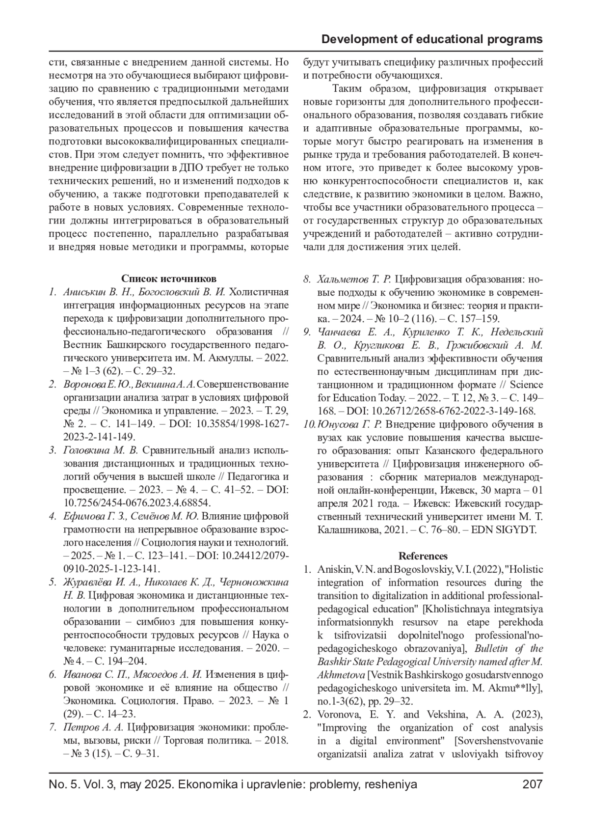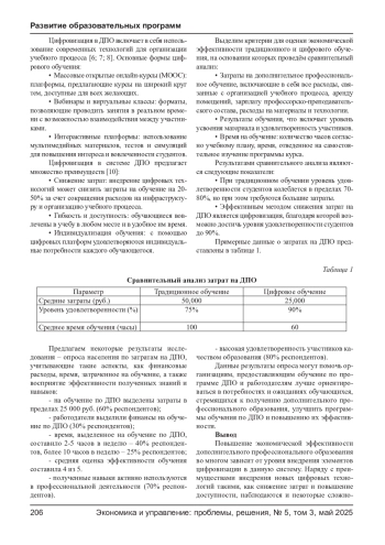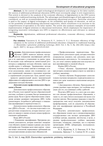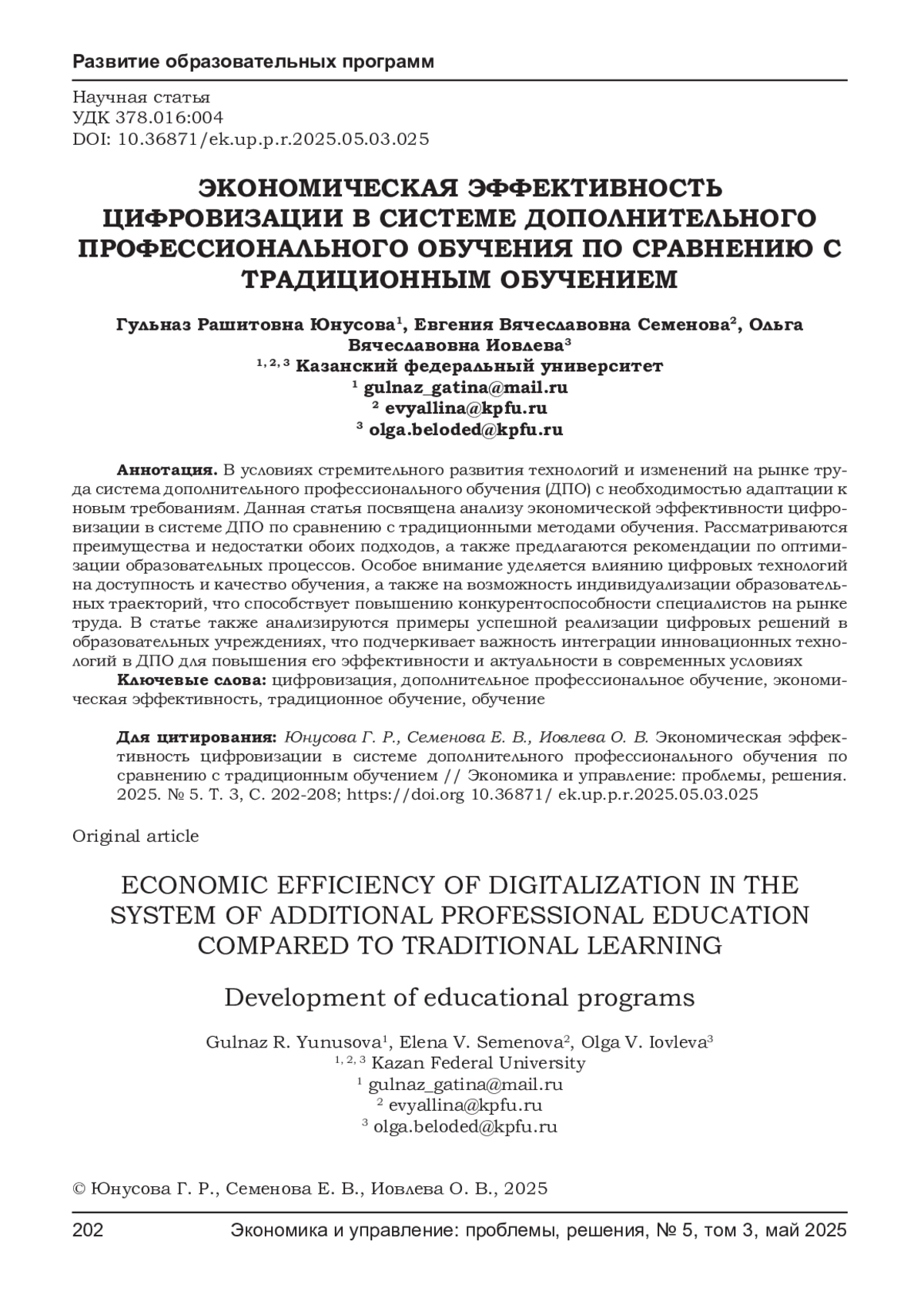 ЮНУСОВА Г. Р., СЕМЕНОВА Е. В., ИОВЛЕВА О. В. ЭКОНОМИЧЕСКАЯ ЭФФЕКТИВНОСТЬ ЦИФРОВИЗАЦИИ В СИСТЕМЕ ДОПОЛНИТЕЛЬНОГО ПРОФЕССИОНАЛЬНОГО ОБУЧЕНИЯ ПО СРАВНЕНИЮ С ТРАДИЦИОННЫМ ОБУЧЕНИЕМ // ЭКОНОМИКА И УПРАВЛЕНИЕ: ПРОБЛЕМЫ, РЕШЕНИЯ. 2025. ТОМ 3 № 5
