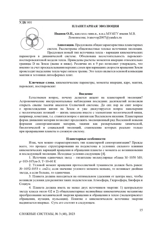 Предложена общая характеристика планетарных систем. Рассмотрены общеизвестные теплые источники эволюции. Предложен новый тип источника тепла - вариации кинематических параметров в динамической системе. Обоснована несостоятельность перовскит-постперовскитовой модели тепла. Приведены расчеты моментов инерции относительно границы D на Земле (выше и ниже). Различие их в 9 раз позволяет утверждать, что именно за счет проскальзывания верхних слоев при вариациях скорости вращения Земли происходит выделение тепла через вязкое трение. Это тепло является основой конвекции мантии и тетоники литосферных плит.