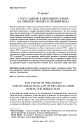 Развитие церковного права в средневековой Чехии можно разделить на несколько этапов. Для раннего этапа, периода существования Чешского княжества, типичным было применение к церкви принципа права собственности. Тот, кто основал храм, был его владельцем. Это ограничивало возможности епископа влиять на действия священника такого частного храма и следить за исполнением церковных канонов. Важным памятником, документирующим постепенное устранение нехристианских пережитков, являются Гнезненские указы чешского князя Бржетислава. В XII в. в скриптории в Оломоуце были изготовлены копии правовых сборников Бурхарда Вормсского и Иво Шартрского. Дальнейшим изменениям способствовала деятельность Пражского епископа Ондржея (1214–1224) по осуществлению в его диоцезе решений IV Латеранского собора и программы папства. XIII – первая половина XIV в. прошли под знаком внедрения новых принципов в жизнь общества: соблюдалась судебная неприкосновенность духовенства и церковного имущества, патронатное право заменило право частной церкви. Период со второй половины XIV до начала XV в. стал временем наибольшего влияния и значения церковного права. Частью программы гуситов был полный отказ от церковного права. После гуситской «революции» не произошло восстановления сложившегося ранее порядка, церковное право в общественном сознании было подчинено праву светскому