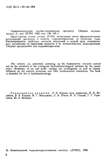 Представлены статьи ученых ЛГМИ, подводящие итоги фундаментальных исследований института в области гидрометеорологии за последние годы. Рассматриваются проблемы экологии воздушной и водной сред, антропогенного воздействия на природные процессы и их математического моделирования. Сборник предназначен для гидрометеорологов.