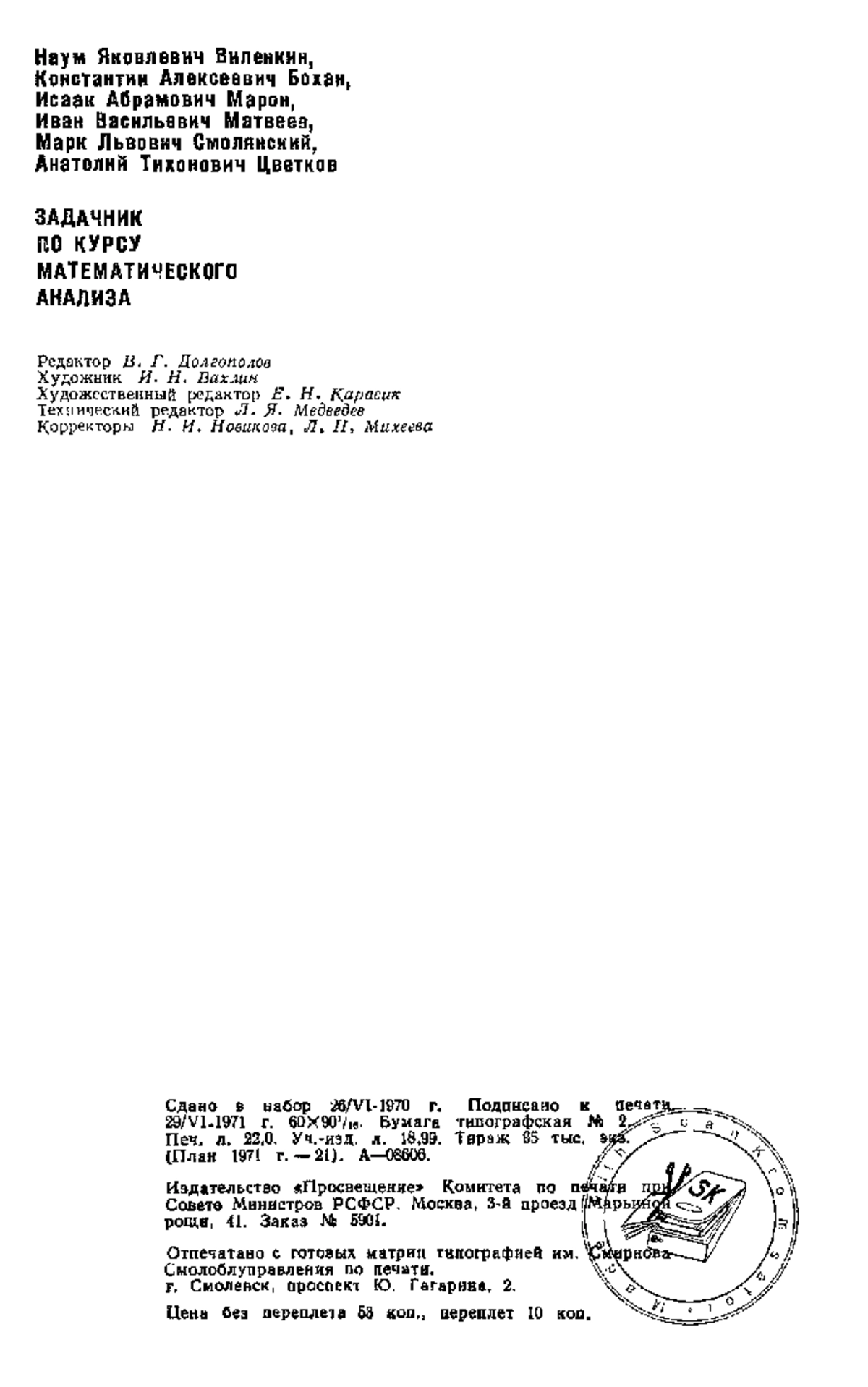 Предлагаемый вниманию читателей «Задачник по курсу математического анализа» предназначен в основном для студентов педагогических институтов (хотя большая часть задачника может быть использована и студентами других учебных заведений — университетов, вузов с расширенным курсом математики и т. д.).
