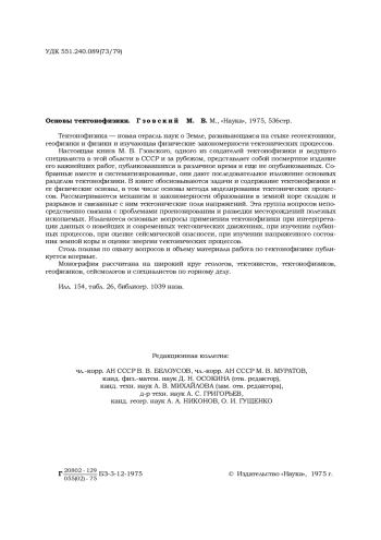 Настоящая книга М. В. Гзовского, одного из создателей тектонофизики и ведущего специалиста в этой области в СССР и за рубежом, представляет собой посмертное издание его важнейших работ, публиковавшихся в различное время и еще не опубликованных. Собранные вместе и систематизированные, они дают последовательное изложение основных разделов тектонофизики. В книге обосновываются задачи и содержание тектонофизики и ее физические основы, в том числе основы метода моделирования тектонических процессов. Рассматриваются механизм и закономерности образования в земной коре складок и разрывов и связанные с ним тектонические поля напряжений. Эта группа вопросов непосредственно связана с проблемами прогнозирования и разведки месторождений полезных ископаемых. Излагаются основные вопросы применения тектонофизики при интерпретации данных о новейших и современных тектонических движениях, при изучении глубинных процессов, при оценке сейсмической опасности, при изучении напряженного состояния земной коры и оценке энергии тектонических процессов.