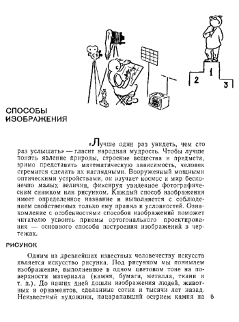Изображение объемных тел на плоскости связано с обязательным соблюдением определенных условностей. Условности черчения отличны от прочих методов изображений, и знание их обязательно для всех, работающих с чертежами. В брошюре в популярной форме излагаются методы плоскостных изображений. Основное внимание уделяется условностям ортогонального проектирования. Иллюстрации автора дополняют основной текст. Рассчитанная на широкий круг читателей, брошюра может служить пособием при изучении курса черчения в школах, училищах и техникумах.