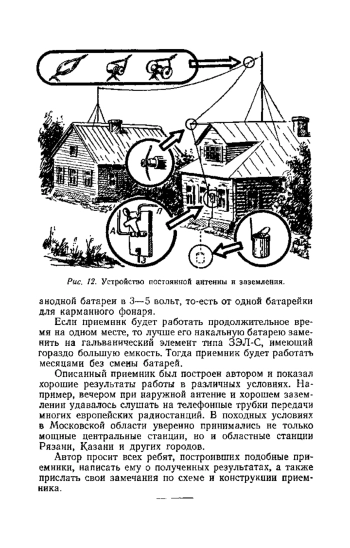 В этой книжке рассказывается о том, как самому построить походный радиоприемник с питанием от батареек для карманного фонаря. Изготовление такого приемника вполне доступно каждому юному радиолюбителю, если он имеет хотя бы небольшие навыки в пайке и в постройке простых детекторных приемников. Но лучше всего, конечно, организовать постройку походных приемников в техническом кружке. Тогда более опытные ребята смогут помочь своим товарищам. Основное назначение нашего походного приемника — работа во время походов, экскурсий и в лагере. Однако приемник можно установить и дома. С хорошей антенной и надежным заземлением он будет работать еще лучше.