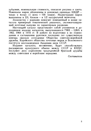 «Представляемое описание почтовых марок, включающее свыше полутора тысяч номеров, охватывает период с 1946 по 1976 год. Описание марок в каталоге дано в хронологической последовательности их выпуска. Оно включает: дату поступления марок в почтовое обращение, название серии, способ печати, размер рисунка или марки, характер перфорации и размер зубцовки, номинальную стоимость, описание рисунка и цвета. Номиналы марок обозначены в денежных единицах КНДР — чонах и вонах (1 вона = 100 чонам). Иллюстрации марок выполнены в 2/3, блоков — в 1/2 натуральной величины. Знакомству с марками помогает помещенный в конце каталога примерный тематический указатель, систематизирующий почтовые выпуски по характерным разделам…»