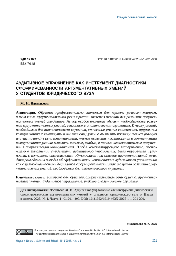 Статья: АУДИТИВНОЕ УПРАЖНЕНИЕ КАК ИНСТРУМЕНТ ДИАГНОСТИКИ СФОРМИРОВАННОСТИ АРГУМЕНТАТИВНЫХ УМЕНИЙ У СТУДЕНТОВ ЮРИДИЧЕСКОГО ВУЗА