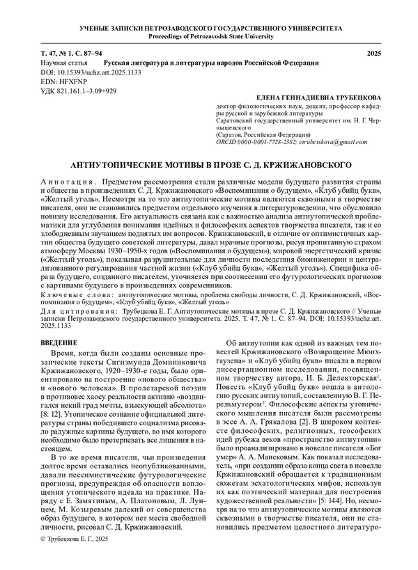 Статья: АНТИУТОПИЧЕСКИЕ МОТИВЫ В ПРОЗЕ С. Д. КРЖИЖАНОВСКОГО