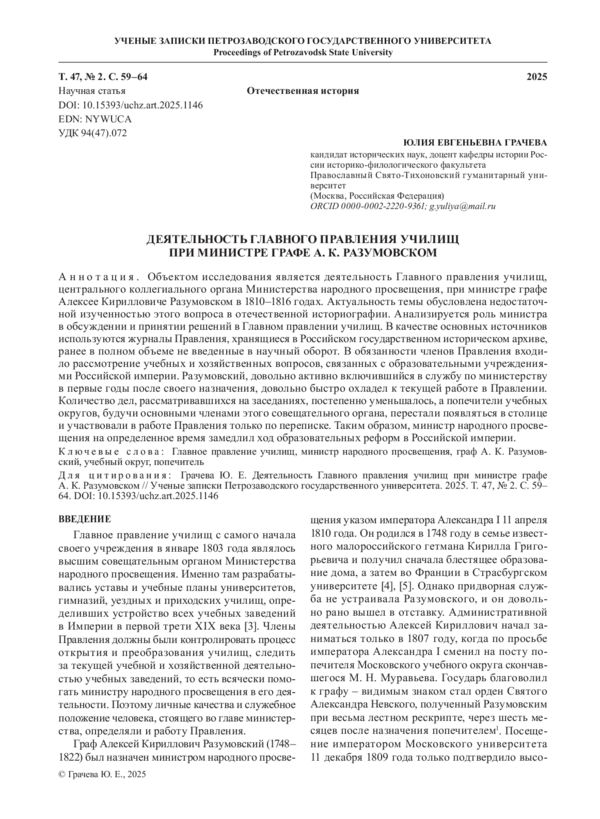 Статья: ДЕЯТЕЛЬНОСТЬ ГЛАВНОГО ПРАВЛЕНИЯ УЧИЛИЩ ПРИ МИНИСТРЕ ГРАФЕ А. К. РАЗУМОВСКОМ