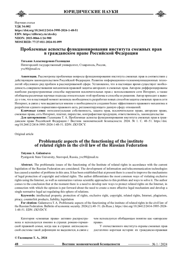 Статья: ПРОБЛЕМНЫЕ АСПЕКТЫ ФУНКЦИОНИРОВАНИЯ ИНСТИТУТА СМЕЖНЫХ ПРАВ В ГРАЖДАНСКОМ ПРАВЕ РОССИЙСКОЙ ФЕДЕРАЦИИ