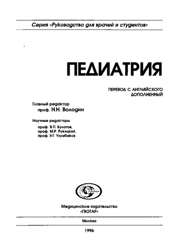 Педиатрия: пер. с англ. доп.//гл. ред. Н.Н. Володин, науч. ред. В.П. Булатов, М.Р. Рокицкий, Э.Г. Улумбеков — М.: ГЭОТАР, 1996. — ISBN 5-88816-003-2. Pediatrics//Ed. by