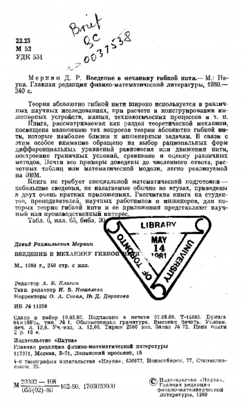 Меркин Д. Р. Введение в механику гибкой нити. — М.: Наука. Главная редакция физико-математической литературы, 1980. — 240 с.