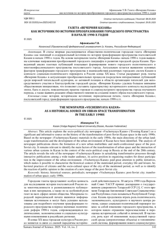 В статье впервые рассматривается общественно-политическая городская газета «Вечерняя Казань» как значимый и содержательный источник по истории трансформации пространства постсоветской Казани в начале 1990-х годов. На основе материалов газеты «Вечерняя Казань» начала 1990-х годов выявлены ключевые направления преобразований городского ландшафта и развития городской среды Казани. Проведенный анализ газетных публикаций показывает формирование нового городского полиэтнического и многоконфессионального пространства постсоветского города. Актуальным остается выявление основных факторов трансформации городского пространства и взаимодействия различных городских систем Казани в контексте социально-политического переворота в России конца XX века. Статья раскрывает роль газеты «Вечерняя Казань» в актуализации преобразовательных процессов посредством интерактивных публикаций среди широкой читательской аудитории, ее активной позиции в области организации читателей для непосредственного участия в благоустройстве городской среды. «Вечерняя Казань» уделяла большое внимание общественным инициативам, что позволяет составить характеристику исторического контекста исследуемой эпохи, быта и досуга, поведенческих практик горожан и социокультурного пространства города изучаемого периода, а также выявить реакцию общественного мнения на создание нового образа постсоветского города.